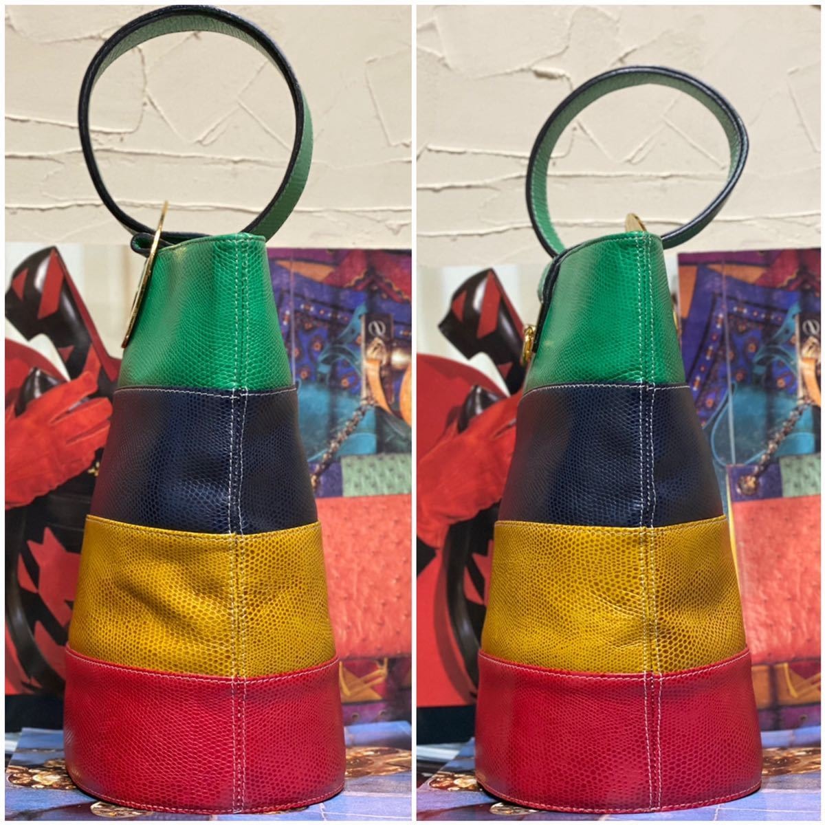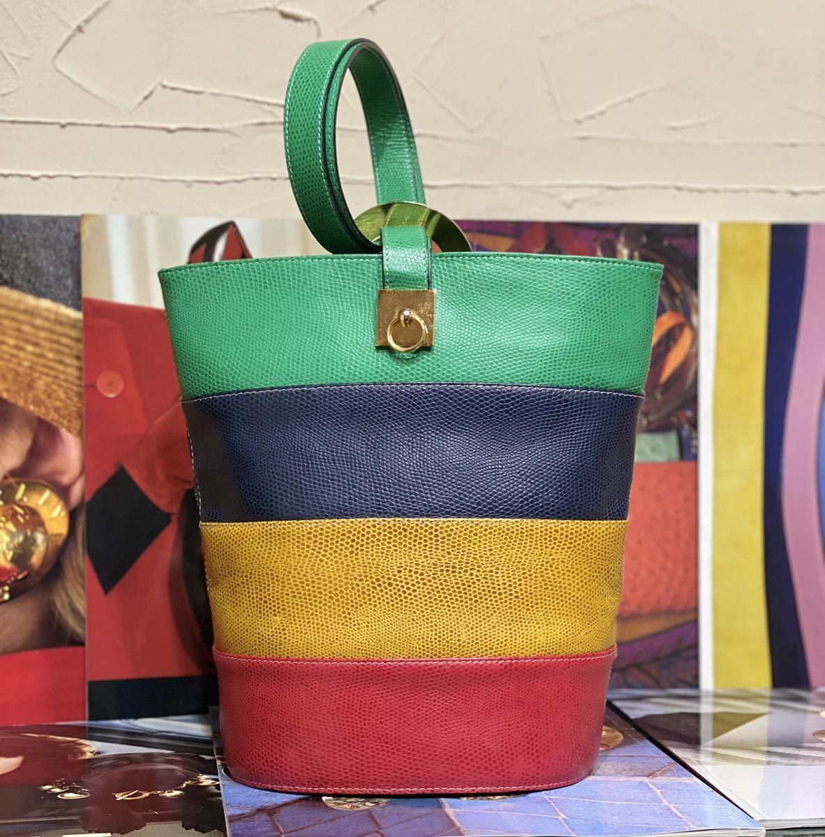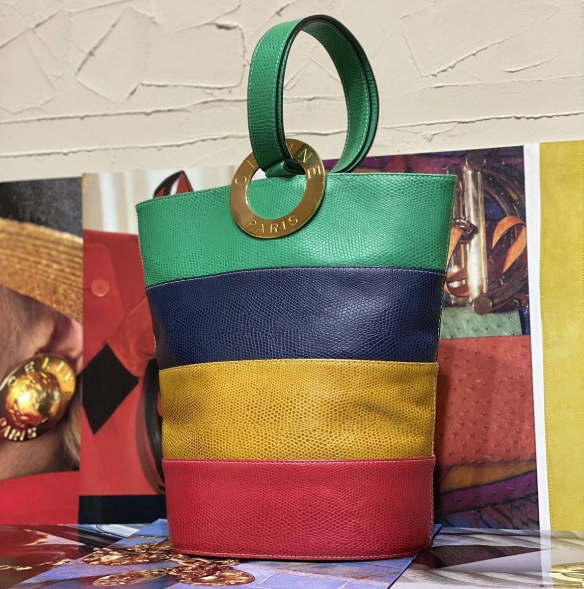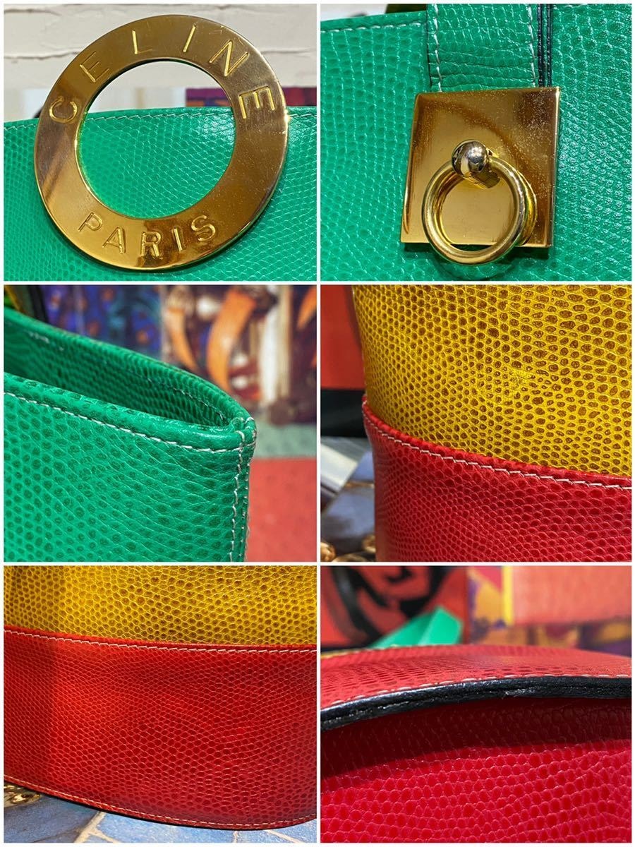 希少なバケツ型でその中でも珍しい型押しレザー、マルチカラーの鮮やかなカラーリング、ゴールドの特大サークル金具、背面にもガンチーニ金具とセリーヌらしさの詰まったエレガントな一品です。