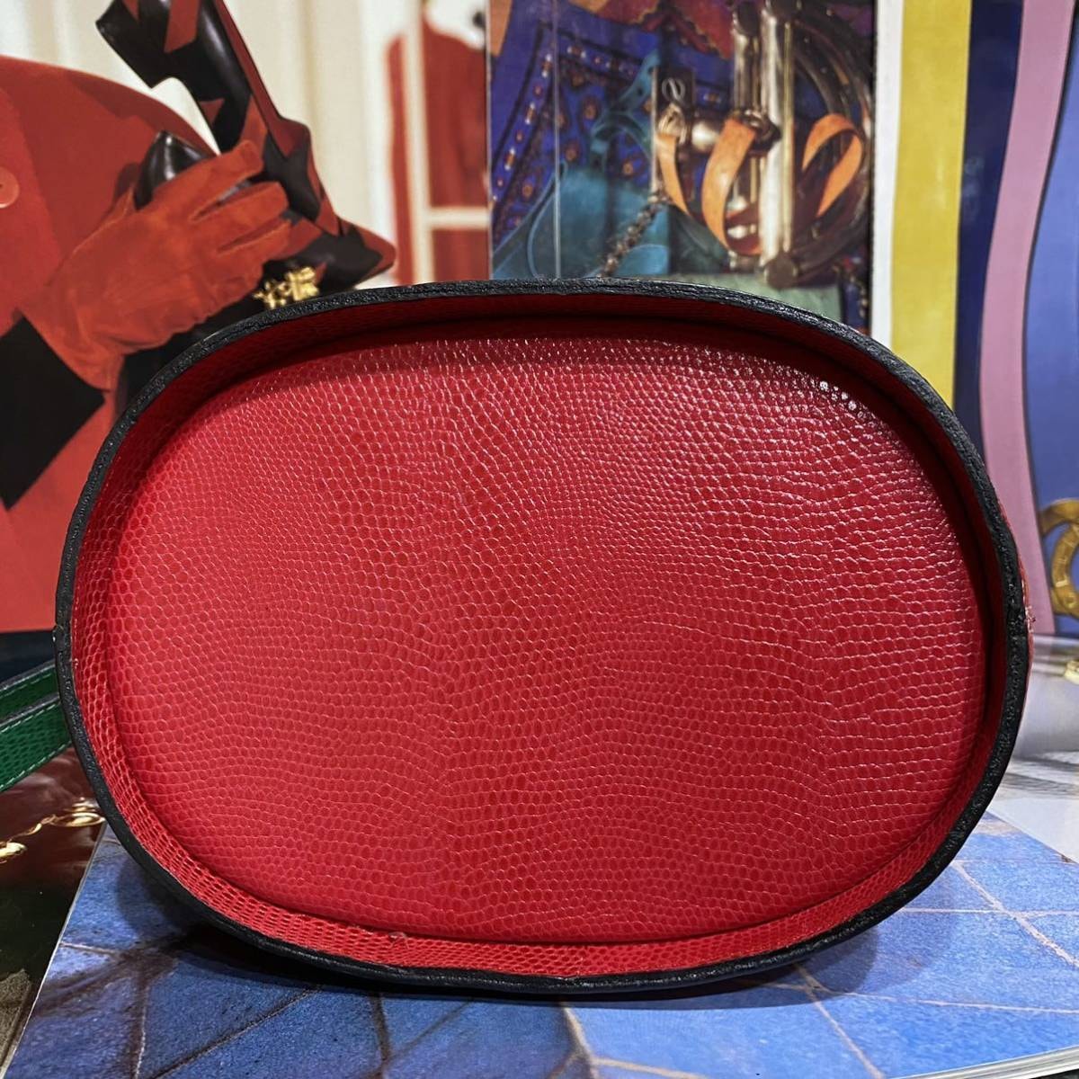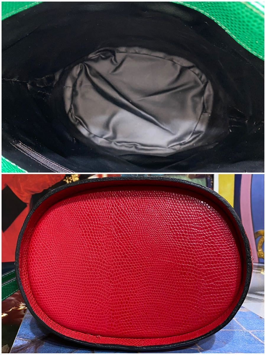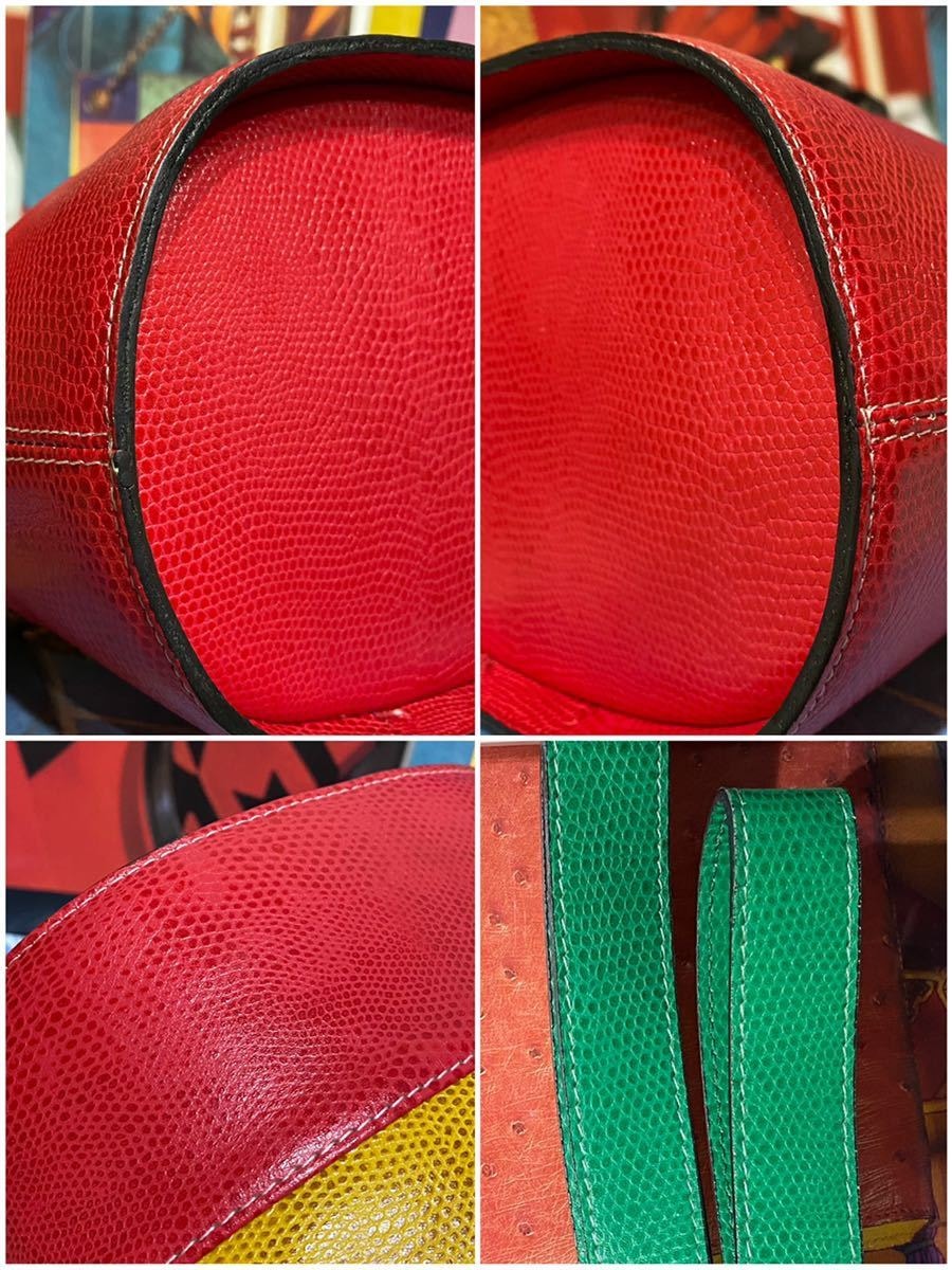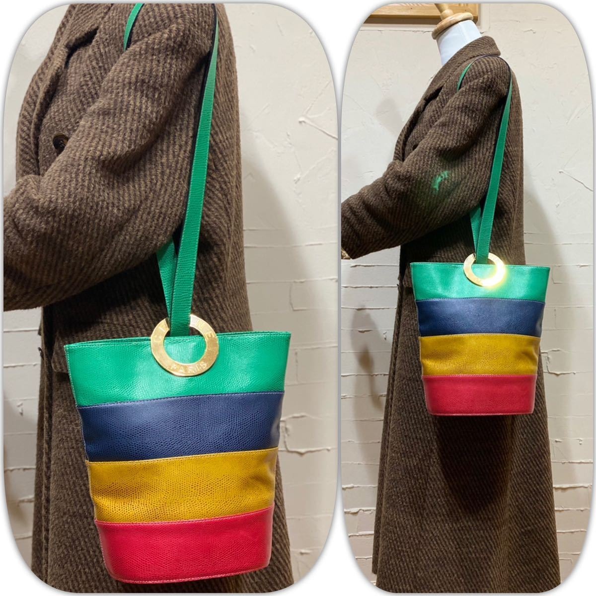 希少なバケツ型でその中でも珍しい型押しレザー、マルチカラーの鮮やかなカラーリング、ゴールドの特大サークル金具、背面にもガンチーニ金具とセリーヌらしさの詰まったエレガントな一品です。