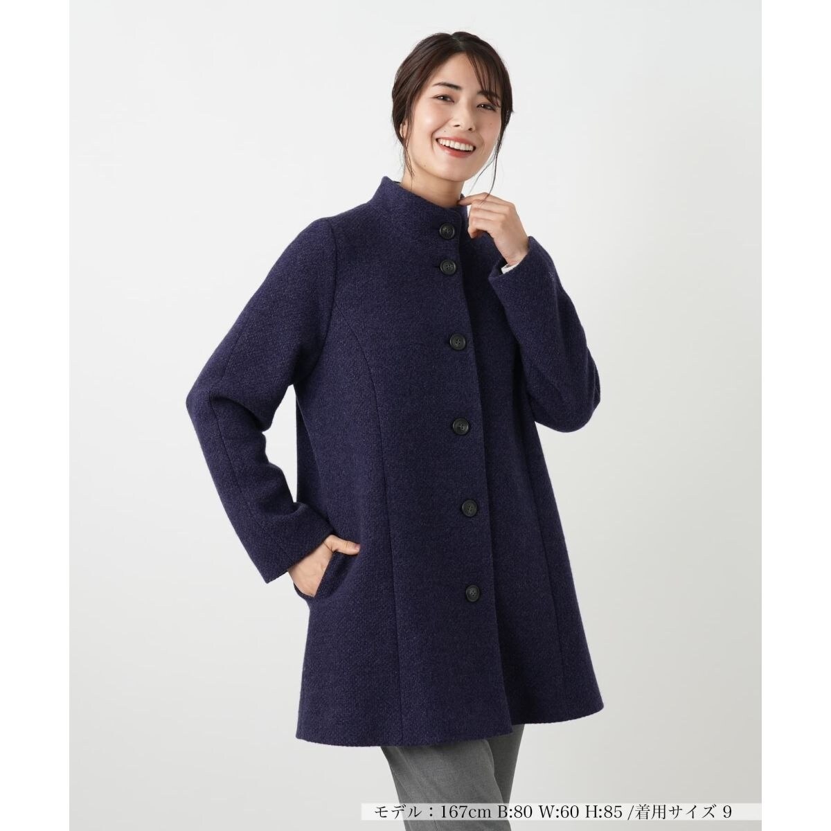 凛としたスタンドカラーが洗練された大人の表情を引き出す、ショート丈のコートです。首元をしっかりと覆う襟の形状は、顔周りをシャープに見せてくれる効果も。フロントにあしらわれた大きめのボタンが、シンプルな中に程よいアクセントとクラシカルな雰囲気を添えています。裾に向かって緩やかに広がるAラインシルエットで、フェミニンな印象に仕上げつつ、厚手のニットの上からでも羽織りやすいゆとりを確保。ヒップが隠れる絶妙な丈感は、パンツスタイルはもちろん、ロングスカートやワンピースともバランスが取りやすく、冬の街歩きから旅行までアクティブなシーンにも寄り添う一着です。