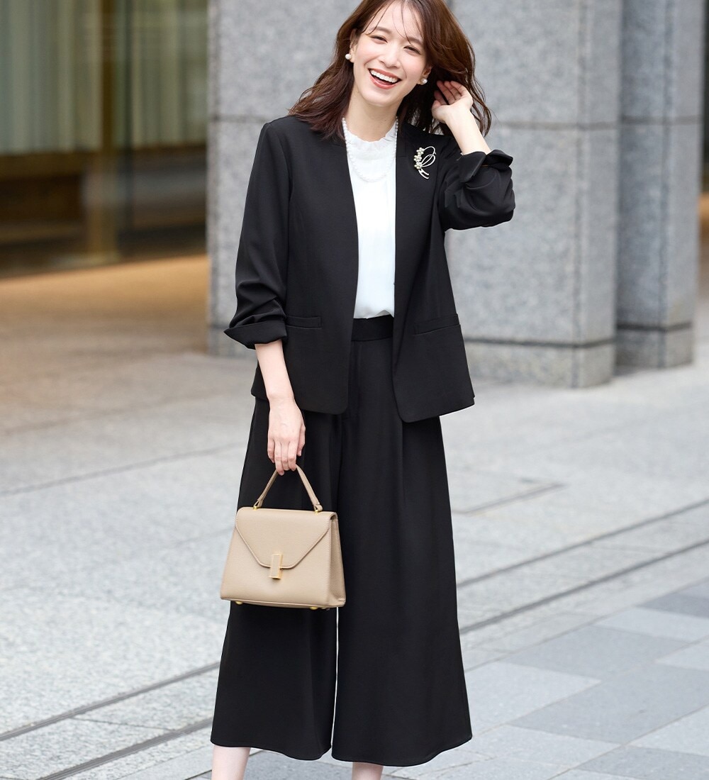 スッキリ見えするカラーレスジャケットにガウチョパンツの組み合わせがスタイリッシュ。