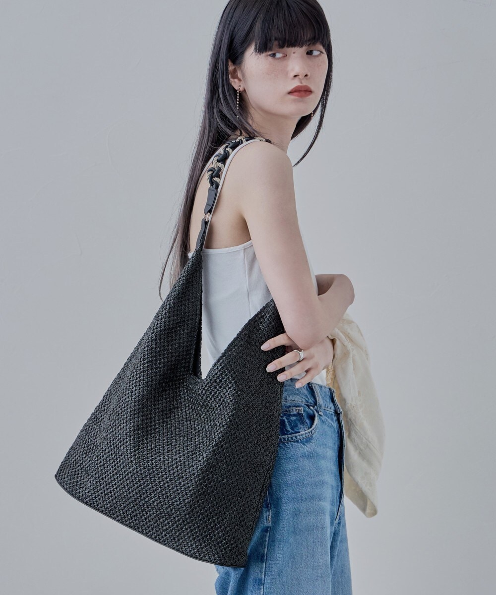 爽やかで季節感のあるペーパー素材にコード編みモチーフの持ち手がデザインのアクセントに、軽くやわらかな手触りとたっぷり入るサイズ感で使い勝手抜群。