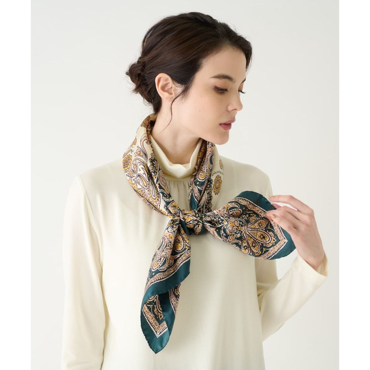 繊細なペイズリー柄を大胆に配置し、イタリアならではの配色で巻いた時に顔映りよく、モダンに見せてくれるスカーフです。ゆったりとした大判サイズは、様々な巻き方やアレンジを楽しむことができます。