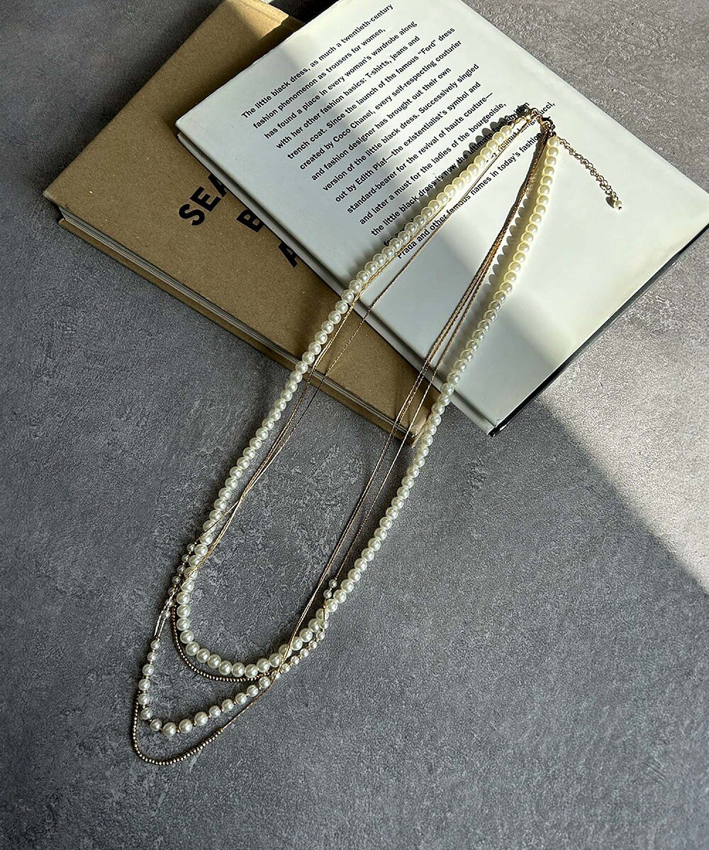 上品なパールと華奢なメタルチェーンをミックスした、マルチレイヤードネックレス。