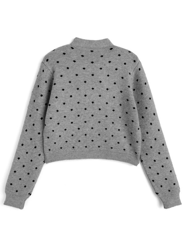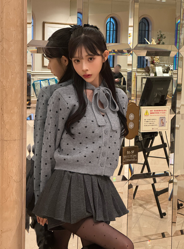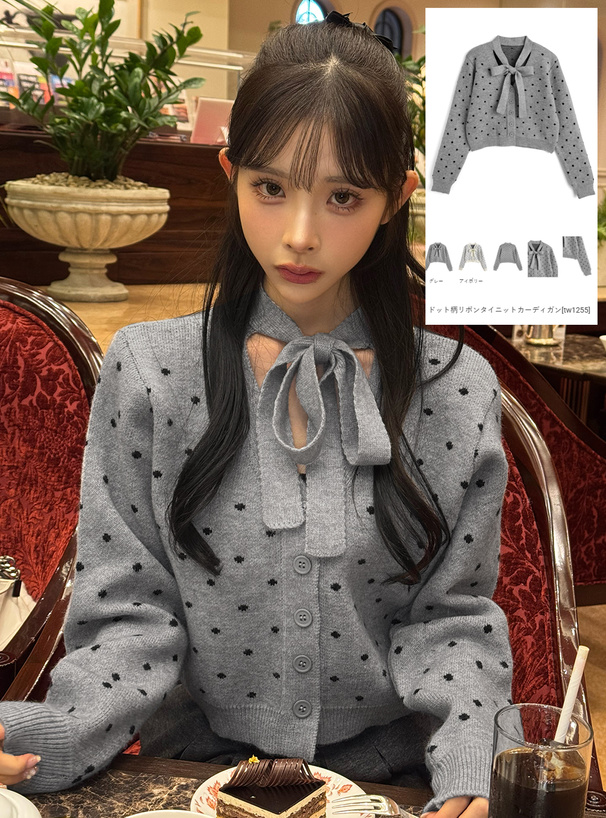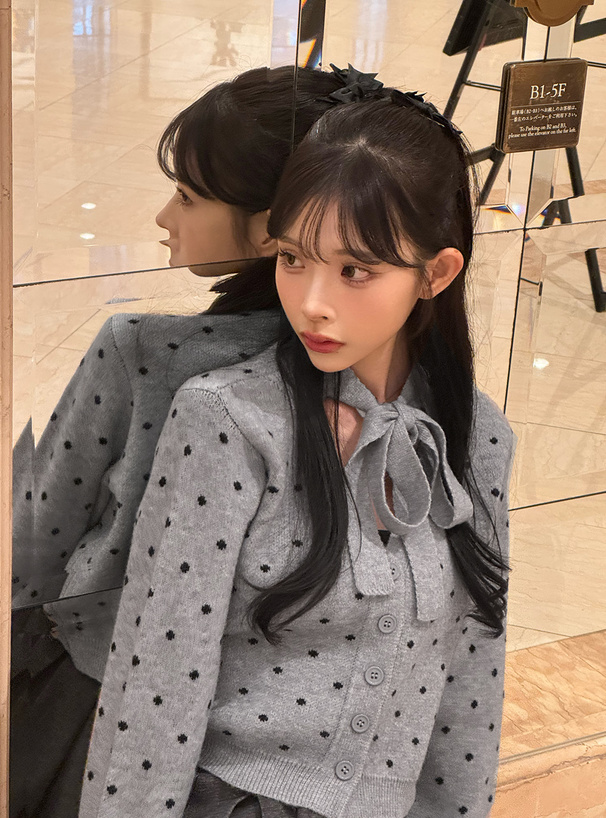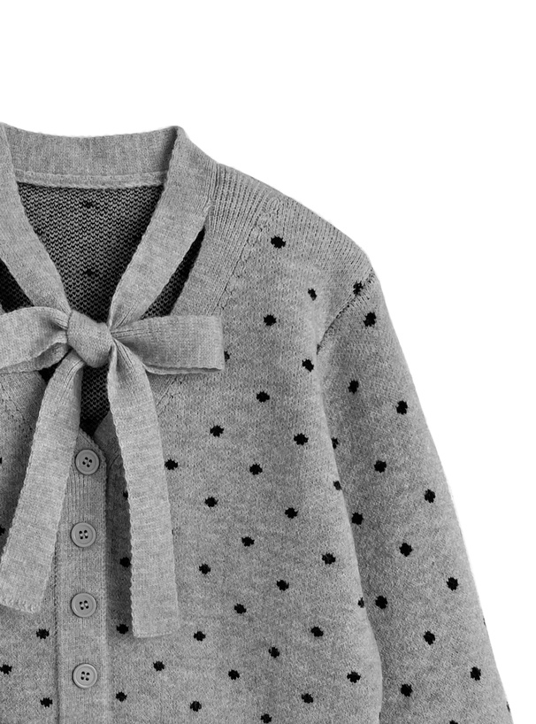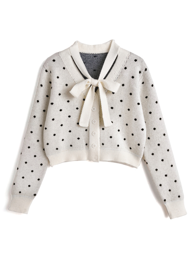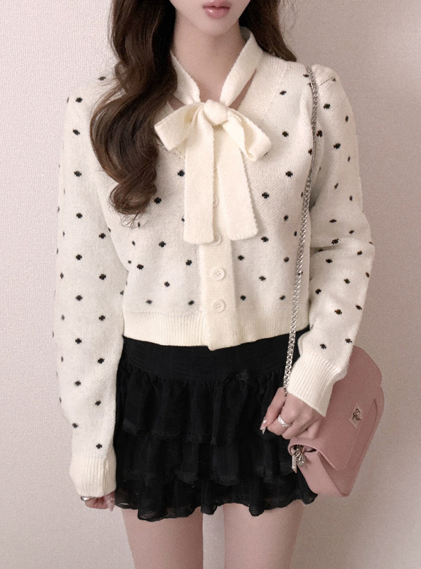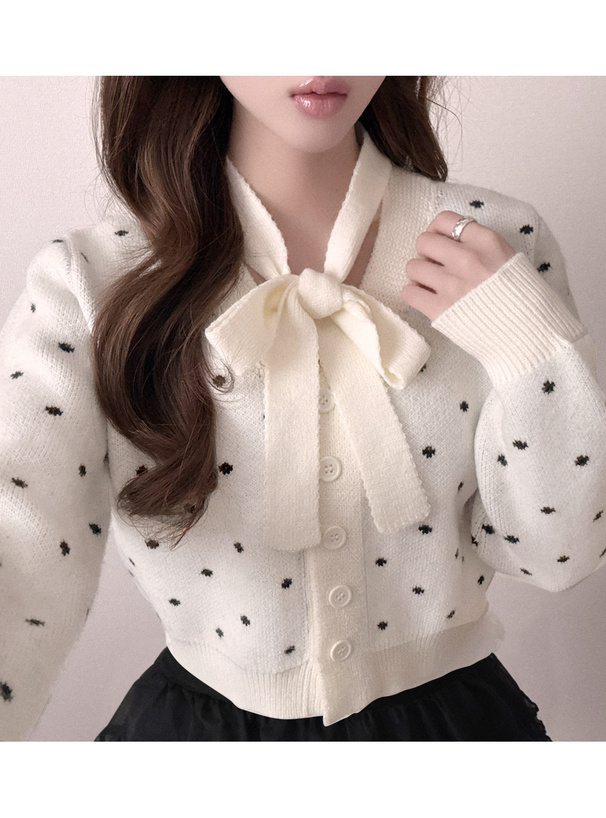 水玉柄をあしらったクラシカルな雰囲気漂うニットカーディガン。