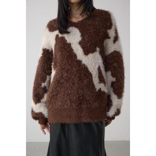 ■ニュアンスカウ柄Vネックニットトップス■ポイント存在感のあるシャギー素材でニュアンス柄を表現したデザインが魅力の、シーズンムード高まるニットプルオーバー。■ディテールナチュラルカラーをベースにしたバイカラーパターンが、柔らかくも印象的なデザインです。ゆったりとしたシルエットで抜け感があり、リラクシーながらも女性らしさを引き立てます。■スタイリングデニムを合わせてカジュアルに、フェイクレザーやサテン素材でモードに着こなすのもおすすめ。スカートと合わせてフェミニンにまとめると、素材感のコントラストが際立ちます。シンプルなアウターを羽織るだけで、素材の存在感が主役に。ベージュやホワイトのワントーンで統一感を出すと、上品で柔らかな印象に。冬のデイリースタイルをアップデートしてくれる主役級ニットです。■生地毛足の長いシャギー糸を使用し、ふっくらとしたボリューム感と軽やかな着心地のニットです。透け感:なし裏 地:なし伸縮性:あり光沢感:なし[注意事項]※画像の商品はサンプルです。実際の商品と仕様、加工が若干異なる場合があります。※画像の商品は光の照射や角度、お使いのモニター環境により、実物と色味が異なる場合がございます。※着用、お取り扱いの際は、アテンションタグをご確認ください。