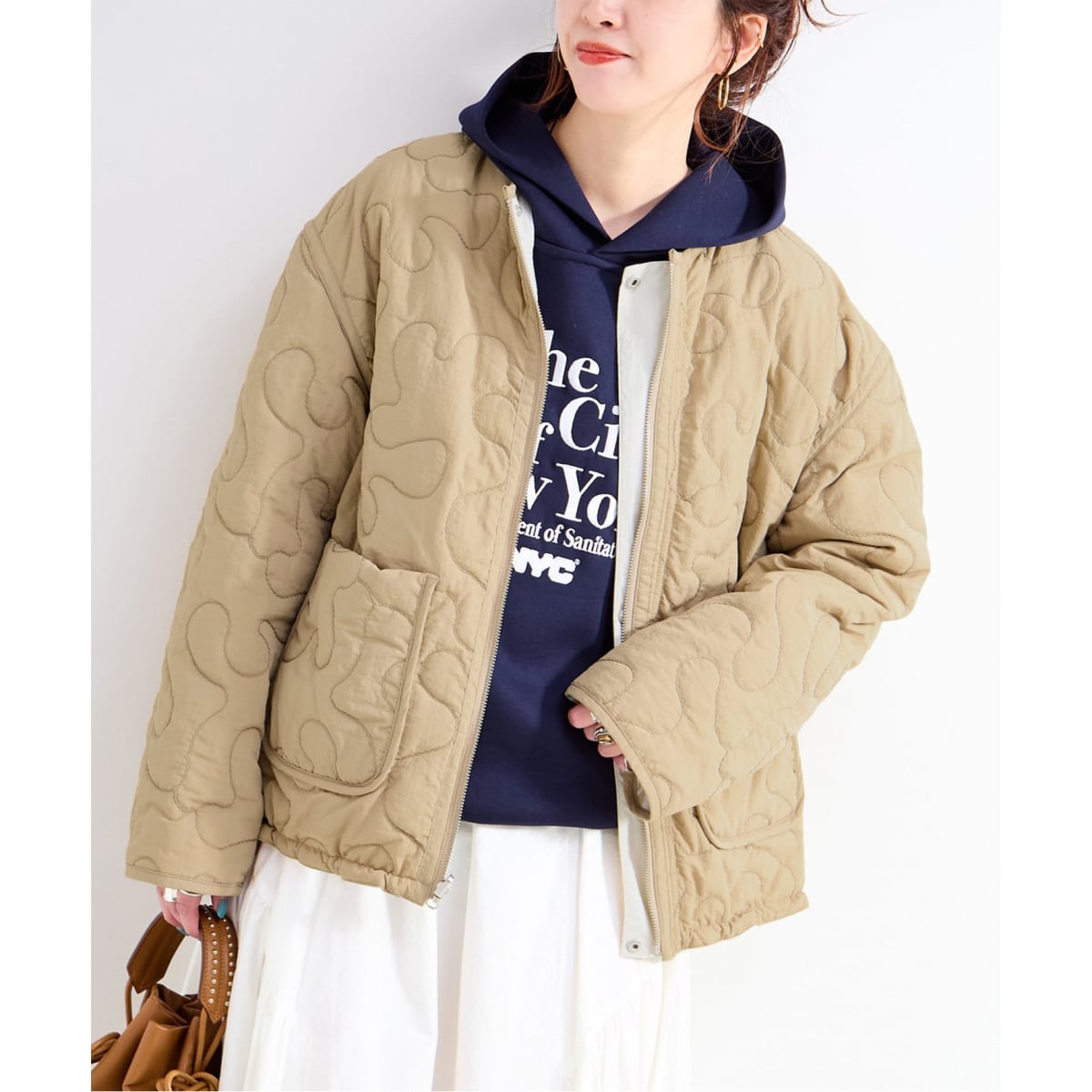 表側はシボ感のあるナイロンタフタ素材で、ベーシックでどんなスタイリングにも合わせやすく、デイリー使いにぴったりです。裏側は、微配色のコード刺繍を施したオリジナルデザイン。さりげない立体感と遊び心のある表情で、着るだけでコーディネートに個性をプラス。裾にはドローコードを内蔵しており、絞ってシルエットの変化も楽しめます。さらに、機能中綿を使用しているため、軽い着心地ながらしっかり保温性もキープ。気分やシーンに合わせて表情を変えられる、優秀アウターです。