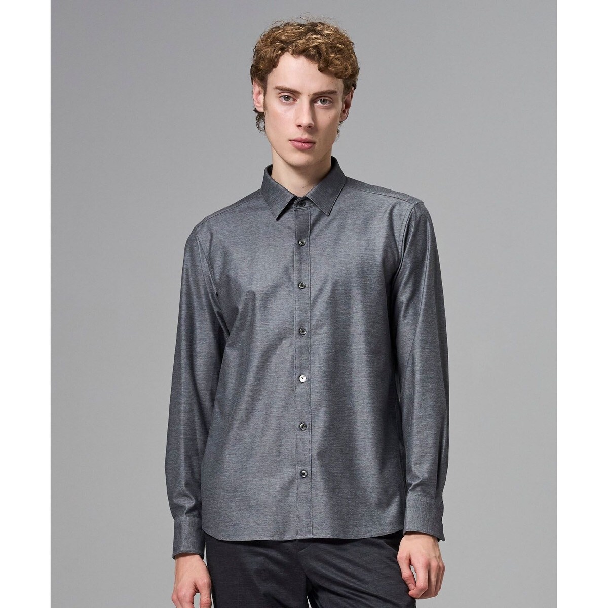 シンプルな長袖レギュラーカラーシャツ。背中にダーツを取り、ほどよくウエストシェイプを効かせたシルエット。ポケットなし。素材を活かしたシンプルデザイン。