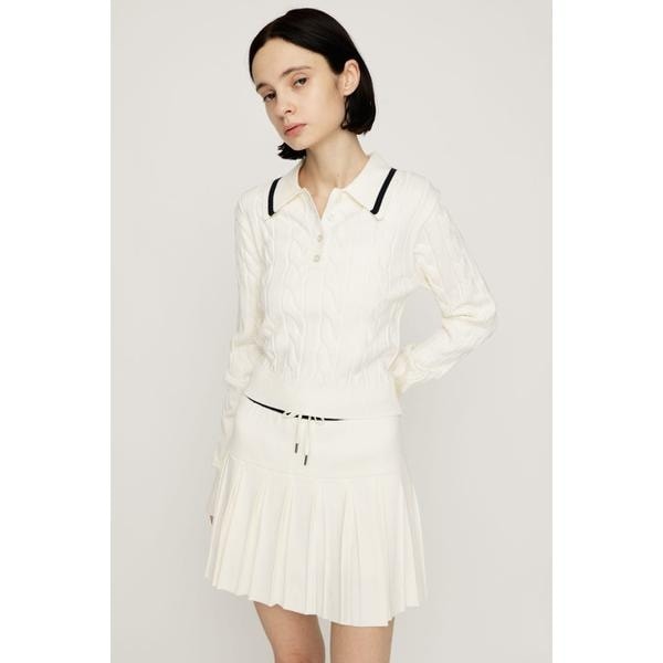 【CABLE KNIT SET UP】■POINT:シーズンムードを感じさせるケーブル編みトップスとプリーツスコートのニットセットアップです。シンプルなデザインながら、襟とスカートのウエストに入った配色ラインがアクセントになり、1枚で着映えするアイテムです。■DETAIL:クラシカルなケーブル編みとカジュアルなリブが程よく、甘すぎないバランスの取れたアイテム。スカートは、裾に向かって広がるプリーツが存在感のある華やかなデザインです。同素材のニットパンツ付きなのも嬉しいポイント。伸縮性のあるニット素材を使用しているので、快適なフィット感とストレスフリーな着心地が魅力のアイテムです。■STYLING:セットアップでの着用はもちろん、別々でも活躍するアイテムです。トップスはベーシックなデニムとの合わせで着映えします。スカートはミニ丈のトップスやアウターとロングブーツで合わせてシーズンムードを高めるガーリーなスタイリングがおすすめです。■FABRIC/MATERIAL:ハリ感と落ち感のバランスが良いポリエステルレーヨンニットを使用。■透け感:なし■光沢感:なし■伸縮性:なし■裏 地:なし本品は、着用(使用)や洗濯クリーニングにより、毛羽立ちや毛玉が発生することがあります。・連続着用はお避け下さい。・毛玉が出来てしまった場合は、毛玉取り器またはハサミで丁寧にカットして取り除いて下さい。[注意事項]※画像の商品はサンプルです。実際の商品と仕様、加工が若干異なる場合があります。※画像の商品は光の照射や角度、お使いのモニター環境により、実物と色味が異なる場合がございます。※着用、お取り扱いの際は、アテンションタグをご確認ください。※一部予約商品につきましては生産上の都合によりお届け予定日や店頭発売と前後する場合もございます。※追加生産商品は、一部の店舗、通販で販売中の場合がございます。予めご了承下さい。