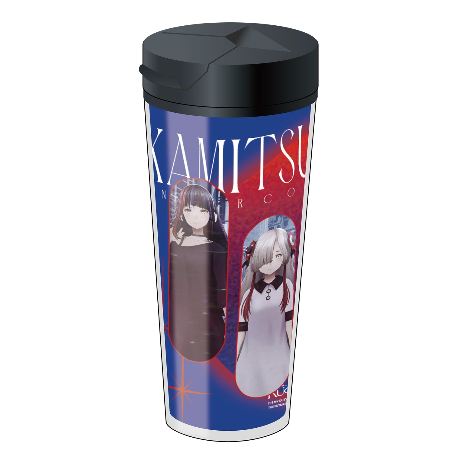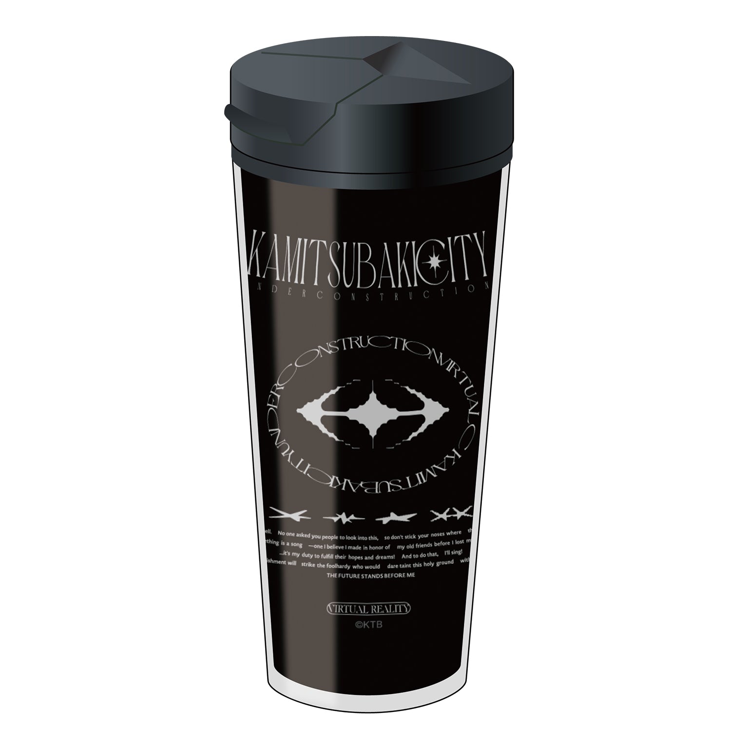 「神椿市建設中。VIRTUAL REALITY」の世界観をイメージしたグラフィックデザインと、キービジュアルのイラストを使用したデザインの2種の着せ替えが楽しめる、蓋付きタンブラーです。