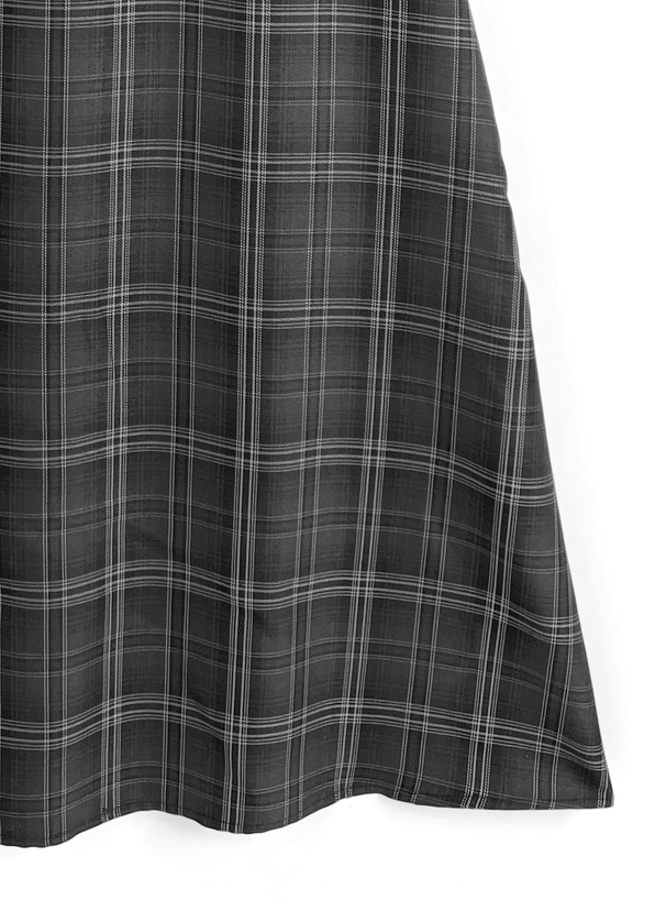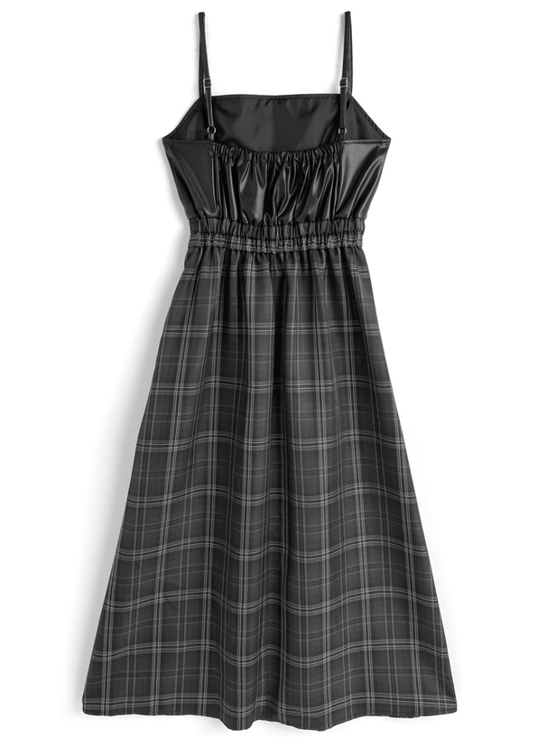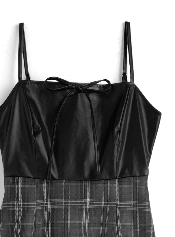 程よいツヤ感のフェイクレザーとシックなチェック柄生地をドッキングしたキャミワンピース。