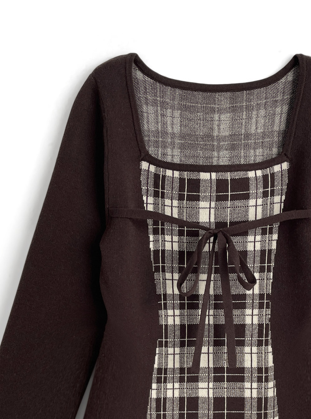 ギンガムチェック柄リボンフレアニットワンピース[lt162]