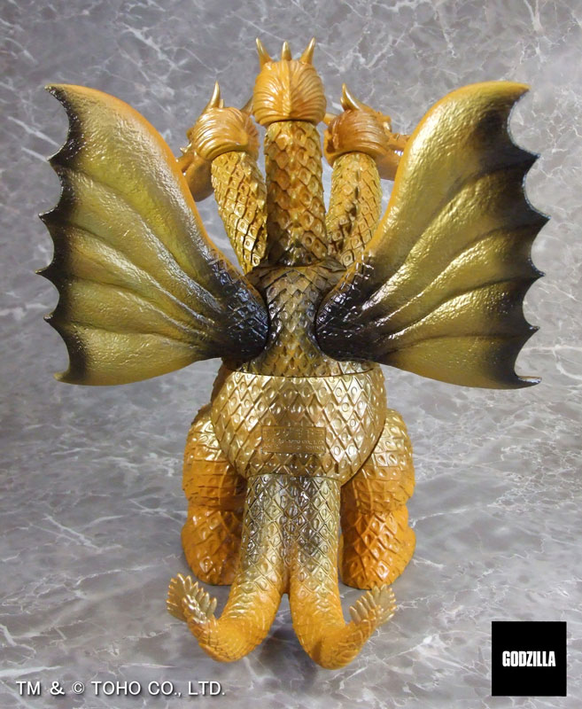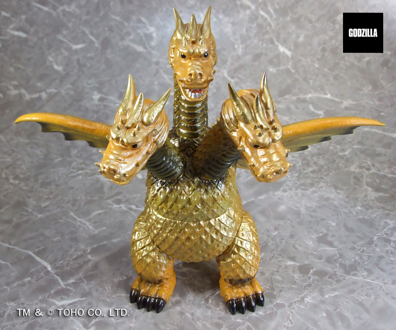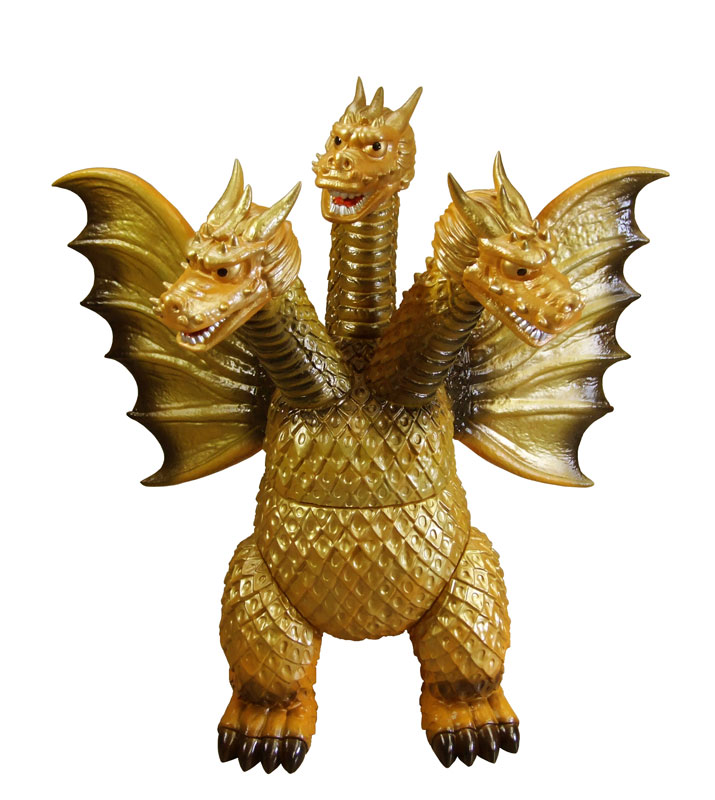 同シリーズとして、今回は3つの頭部と3本の首、2本の長い尾、全身を覆う黄金色の鱗、太い2本の足に加え、飛行に用いる巨大な1対の翼を持つキングギドラを、キングザウルスシリーズで発売されていたレトロな丸みのある造形フォルムにて新規造形。グレートザウルスシリーズのサイズで立体化!