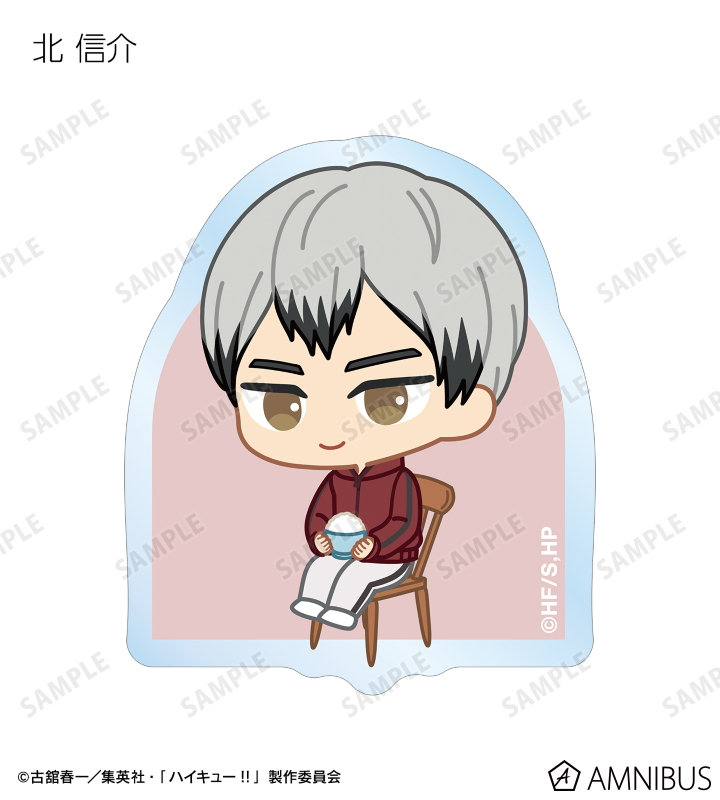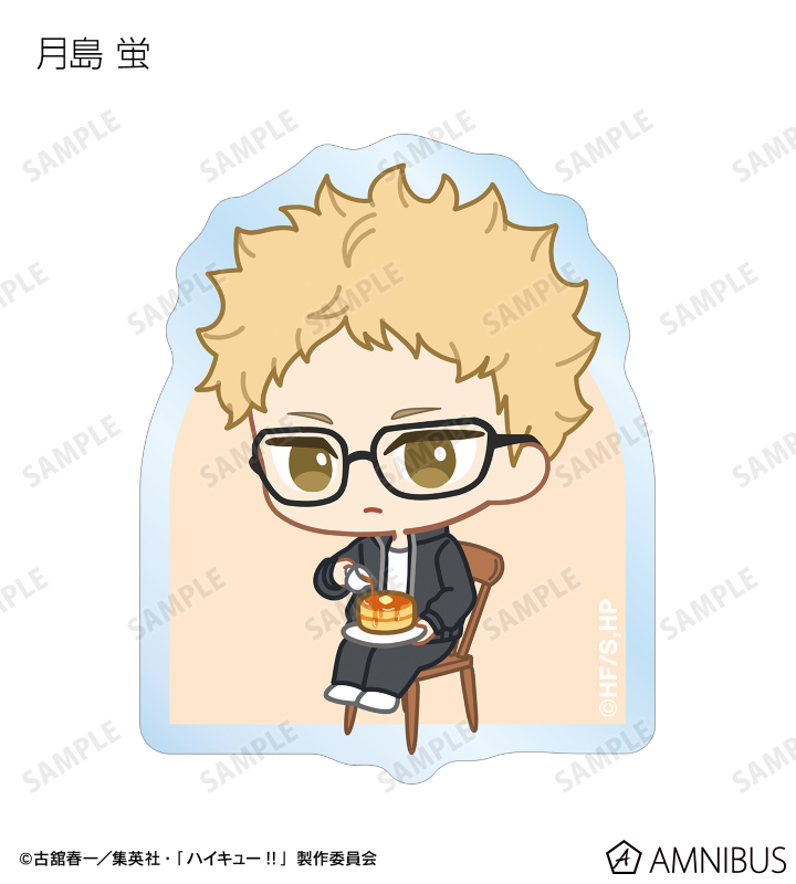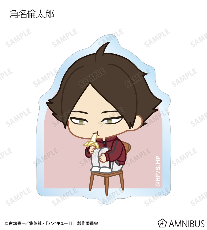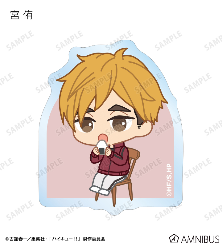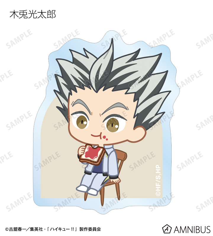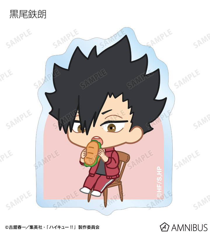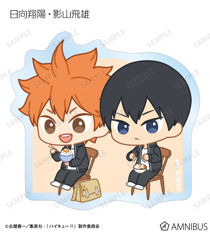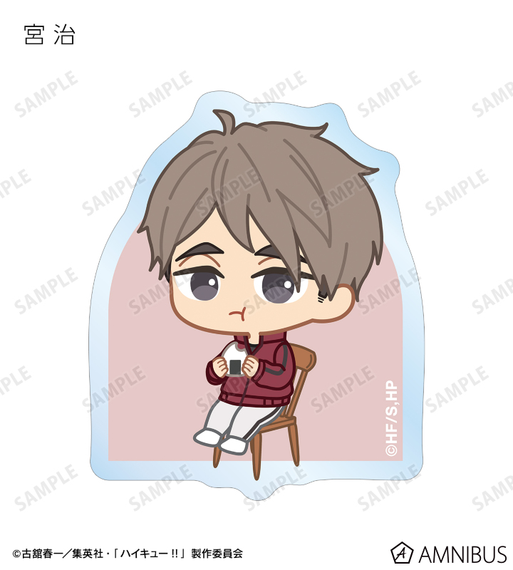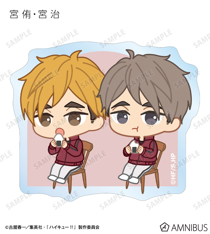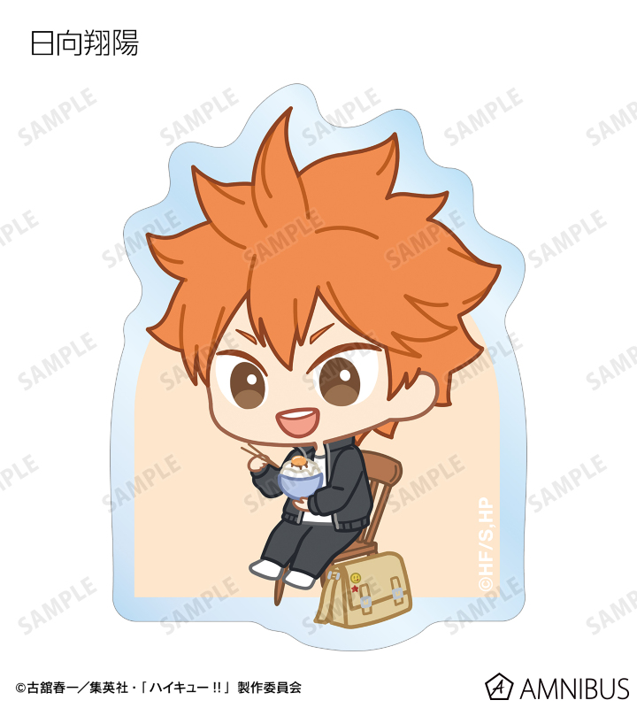 日向翔陽、影山飛雄、月島 蛍、山口 忠、及川 徹、岩泉 一、黒尾鉄朗、孤爪研磨、青根高伸、二口堅治、牛島若利、天童 覚、木兎光太郎、赤葦京治、宮 侑、宮 治、北 信介、角名倫太郎の描き起こしちびキャライラストをメインにデザインし、ダイカットのステッカーに仕上げました。
