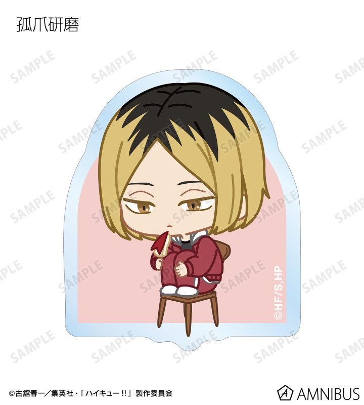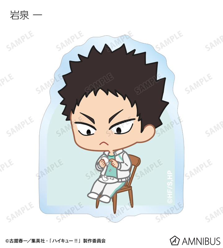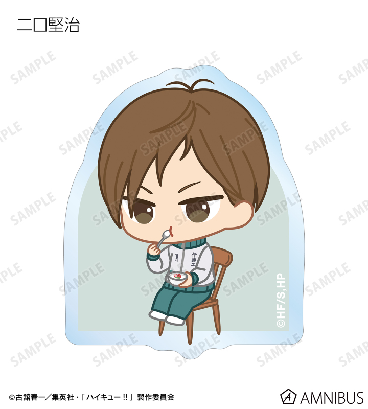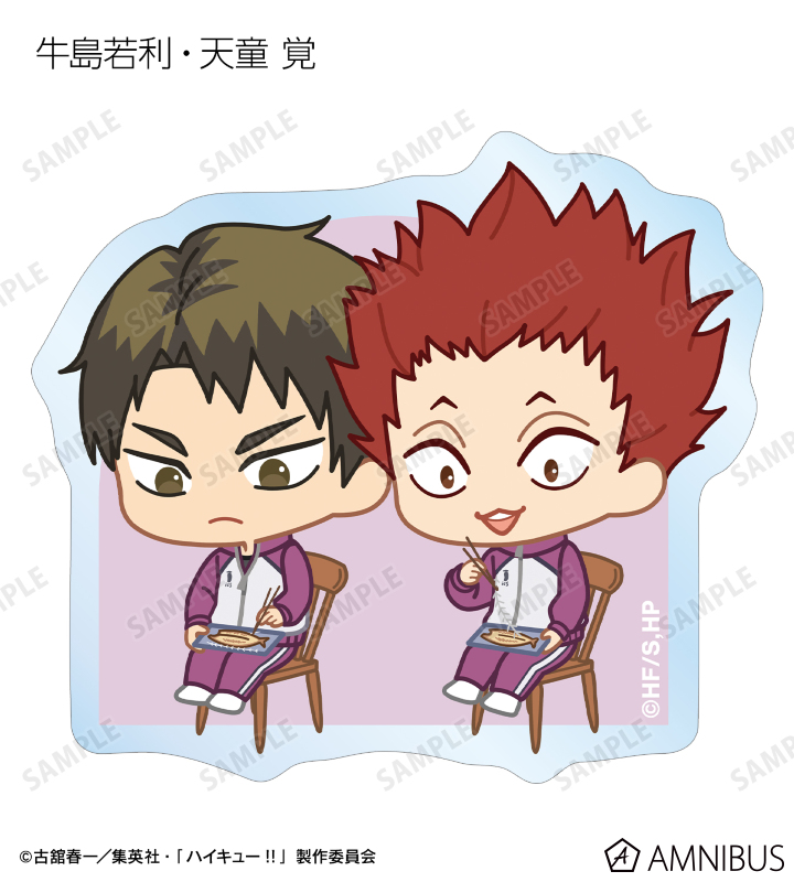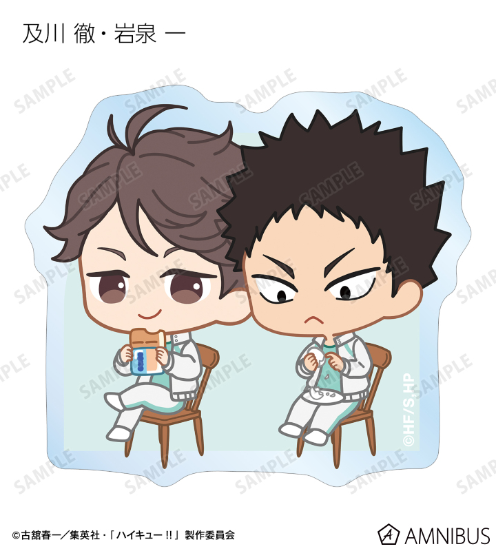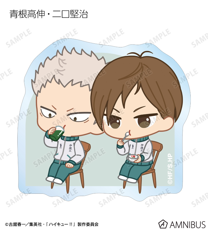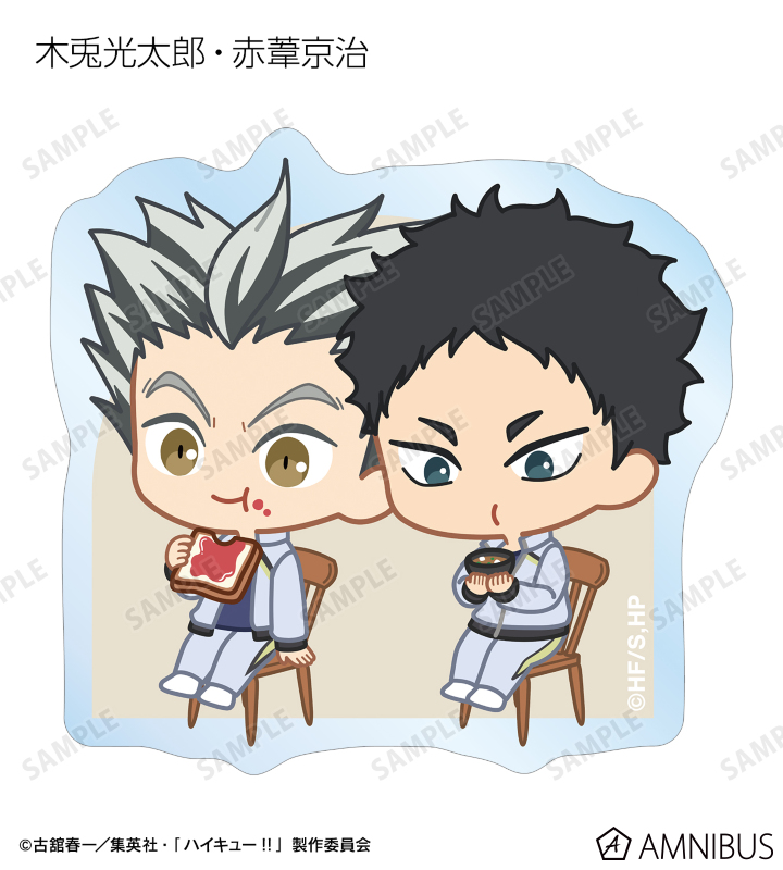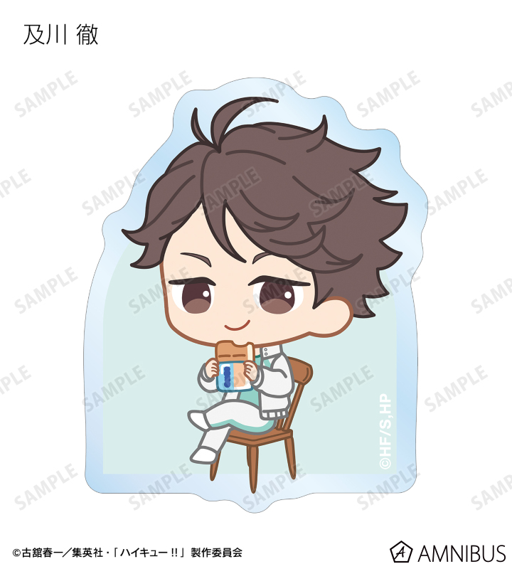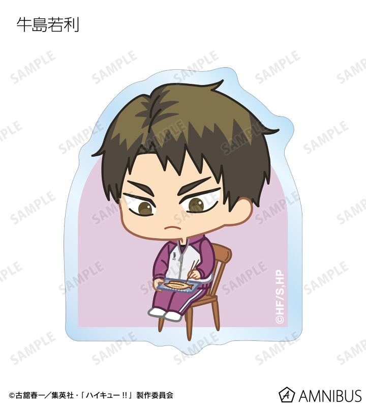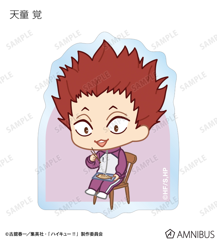 日向翔陽、影山飛雄、月島 蛍、山口 忠、及川 徹、岩泉 一、黒尾鉄朗、孤爪研磨、青根高伸、二口堅治、牛島若利、天童 覚、木兎光太郎、赤葦京治、宮 侑、宮 治、北 信介、角名倫太郎の描き起こしちびキャライラストをメインにデザインし、ダイカットのステッカーに仕上げました。