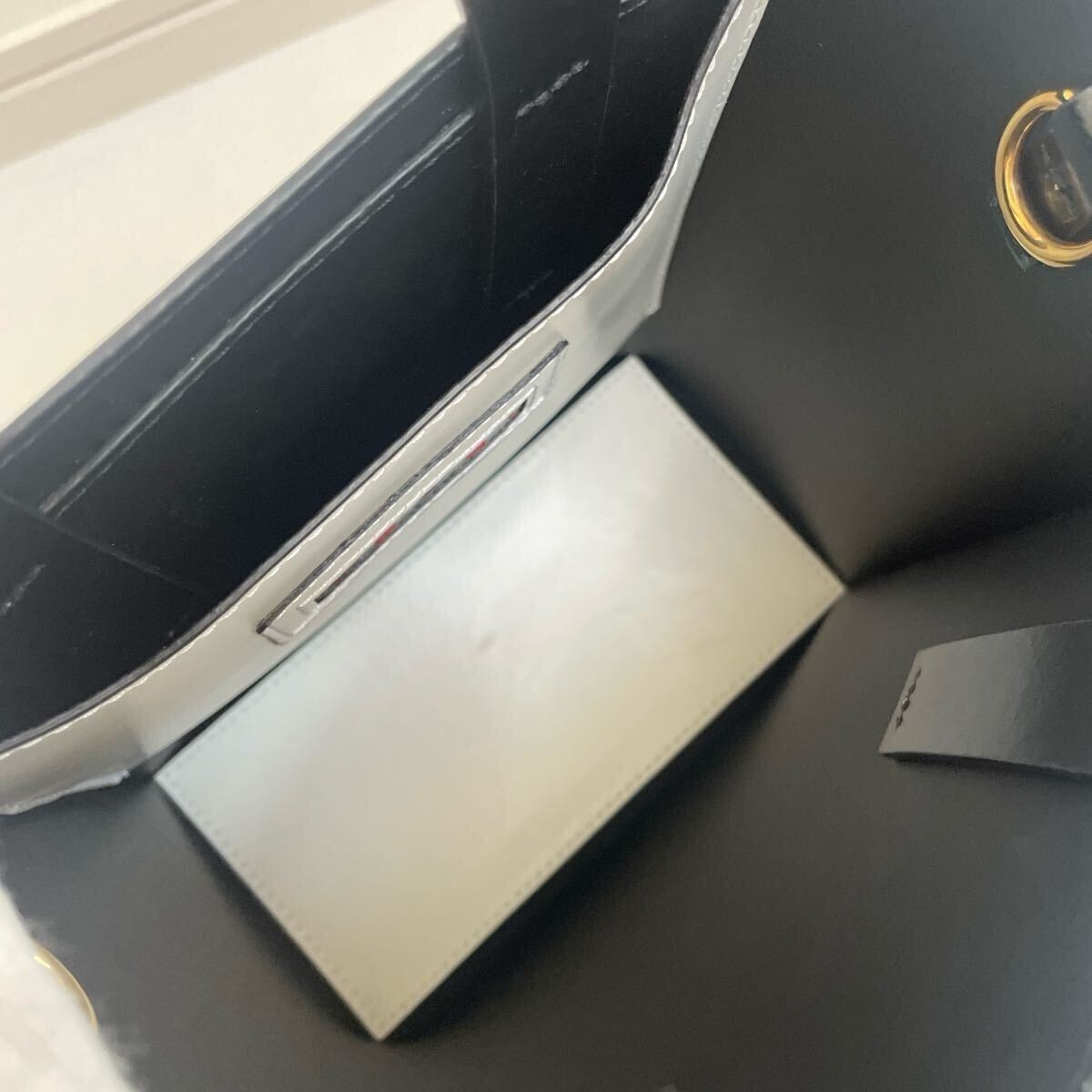 タンブルレザーNorth/Southトートバッグ、ミニサイズ、オープントップ、内側にファスナー付きポケット。ファブリックライニング。レザートップハンドル、取り外し可能なショルダーストラップ、バックルで調節可。カラーブロックのデザイン。ゴールドトーンのメタルパーツ。外側にゴールドのプリントロゴ。 Made in Italy
