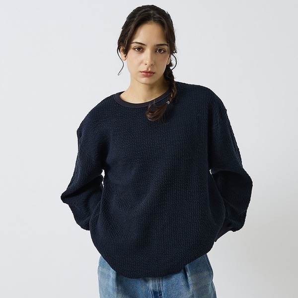 表情豊かな膨れジャガード生地は、ほどよい厚みと伸縮性があり、秋冬にぴったり。