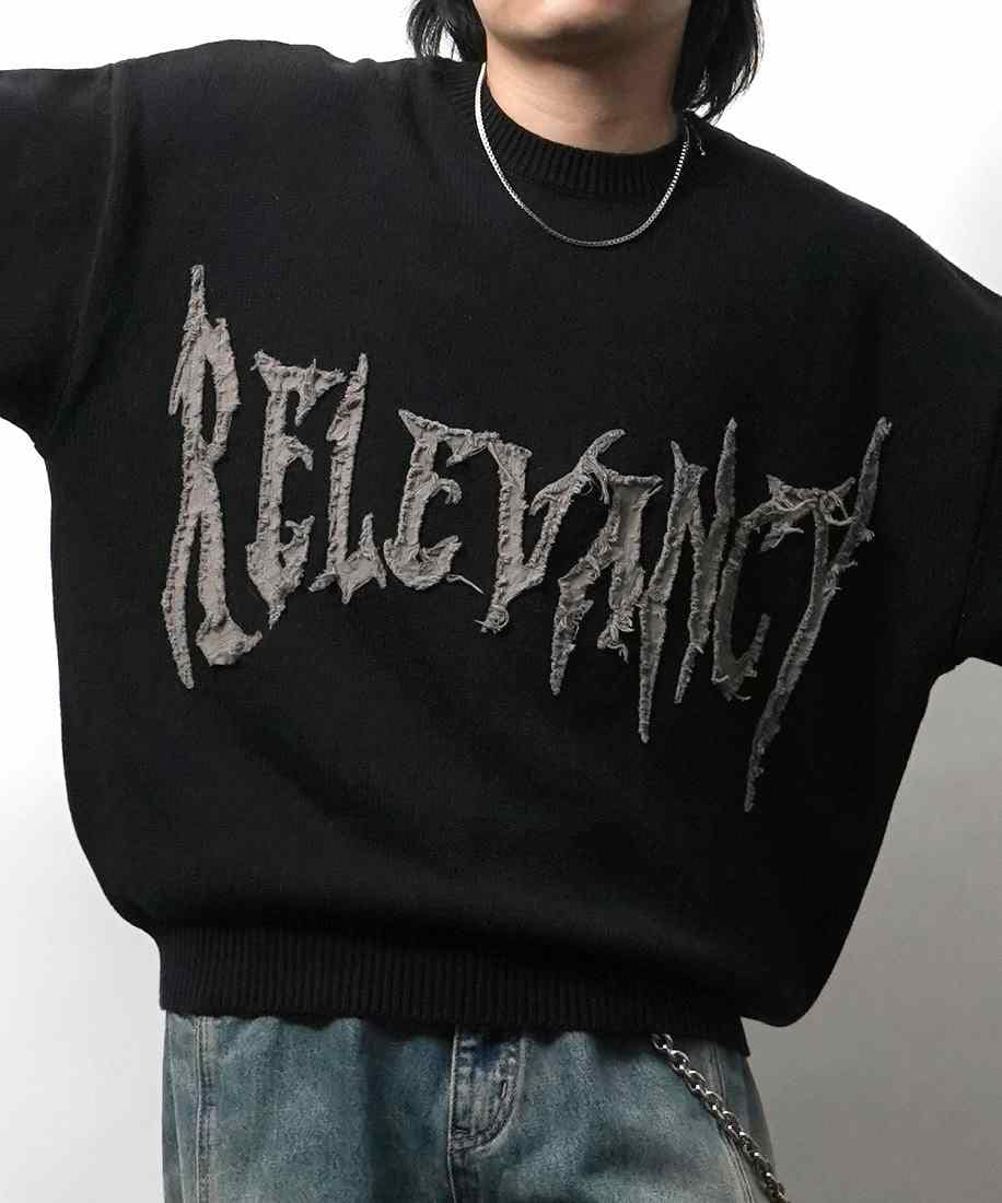 エッジの効いたロゴが視線を集める。ストリート・グランジテイストの主役級ニット。