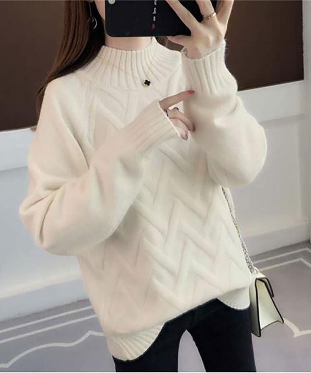 長袖トップス チュニック ハイネック アイボリー レディース