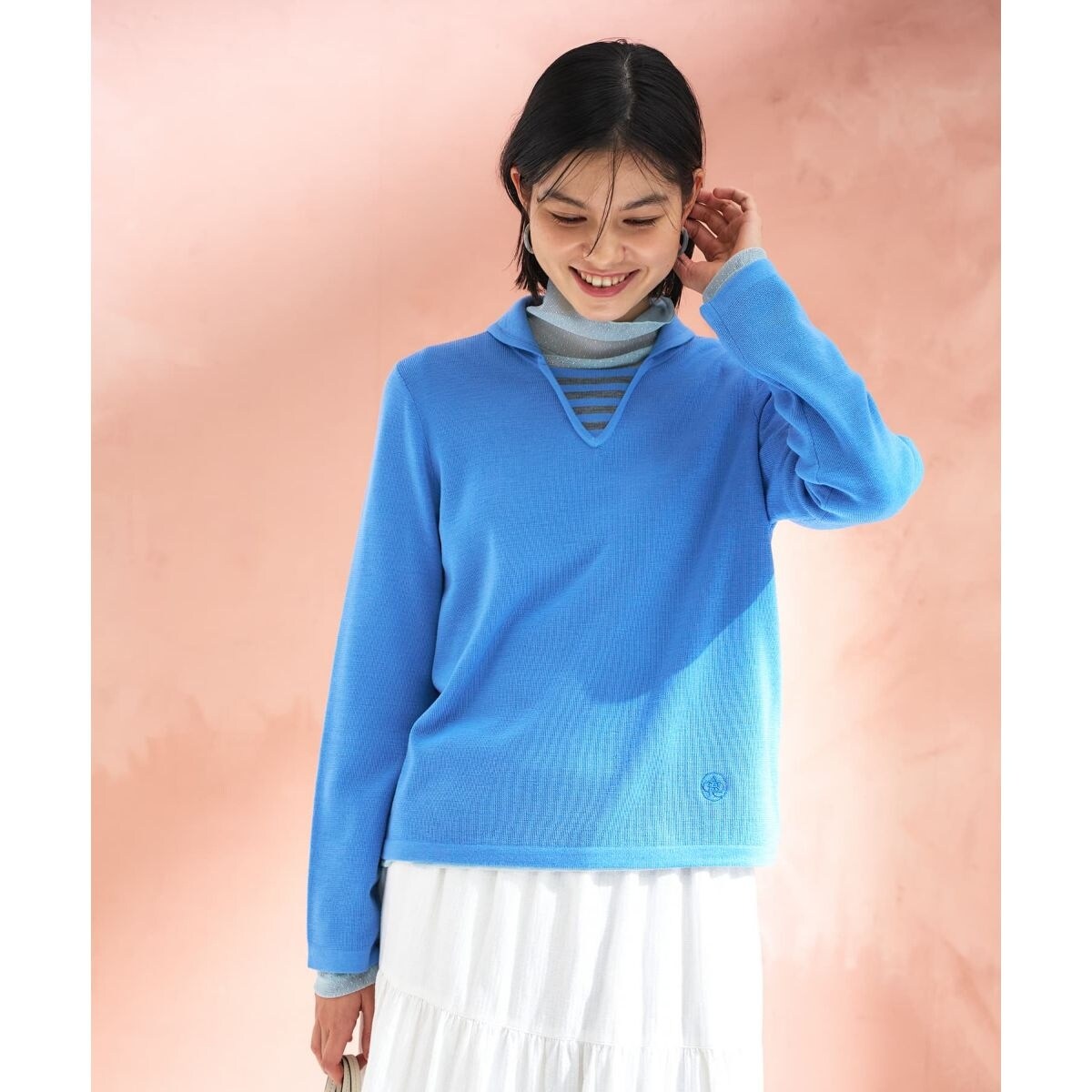柔らかな印象を与える、ラウンドカラーのニットトップス。襟裏にはボーダーをあしらい、ちらりと見える際のさりげないアクセントに。やや薄手のニット地ながら暖かく、程よい伸縮性も備えているため、これからのシーズンのレイヤードスタイルに最適です。フロントの左裾にはロゴ刺繍を施し、クラシカルなムードを高めました。オフィスからデイリーカジュアルまで幅広く着用いただけるアイテムです。