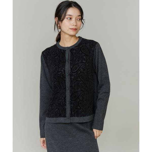 ■デザイン立体感のある繊細なモールレースを前身頃にあしらった、スタイリングを格上げするカーディガン。前身頃はニットとレースの2枚仕立てになっており、上品でリッチ感のある印象に。ニットと同色の包み釦もポイントです。■素材立体感のあるモールレースとニットのコンビネーションです。ニットの表側には、滑らかな表面感とハリとコシを兼ね備えたウール100%素材を使用し、裏側には適度な肉感とストレッチ性を持たせるためキックバックの強いポリエステル一緒に編み込みました。同素材のニットスカート品番:7154175856■サンプル撮影商品画像の商品はサンプルです。実際の商品とはサイズや色味、素材、デザイン等の仕様が若干変更になる場合がございます。■カラーについては、可能な限り実際の商品に近いカラーで撮影をおこなっておりますが、照明の関係により実際の製品とは色味が違って見える場合があります。またパソコン・スマートフォンなどの環境により、若干製品と画像のカラーが異なる場合もございます。現物と画像のカラー差異については返品理由となりませんので、予めご了承ください。■サイズ表記はあくまで目安となります。