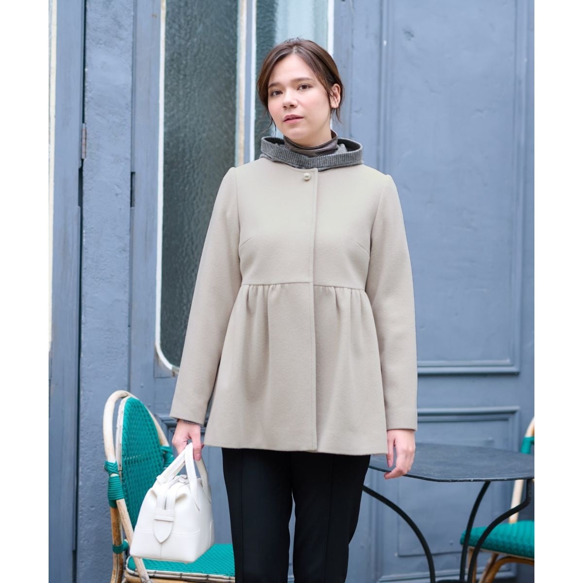 ブラウスのような軽やかさを纏ったシルエットが特徴のジャケット。ウエスト部分には高め位置でギャザーを施し、全体のラインを美しく引き締め、スタイルを引き立てます。大きめのパール調ボタンがアクセントとして存在感を放ち、大人の品格を際立たせつつ、程よいハンサムな雰囲気を演出。女性らしい優雅さとクールさを併せ持つ一着として、デイリーから週末のお出かけまで、多彩なシーンで幅広く活躍すること間違いなしです。フロントはスナップボタンにより開閉が可能。襟元のパール調ボタンは飾りボタンとなります。