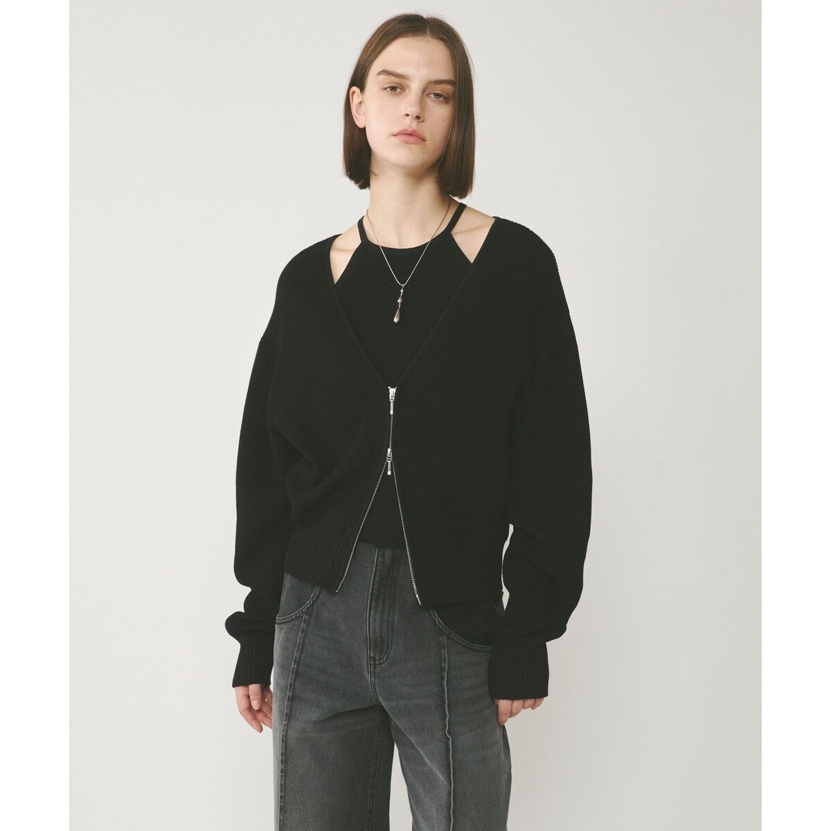 コットンブレンド糸で片畦編みしたジップブルゾン。ゆるっとしたドルマン型の旬なコクーンシルエットがポイントです。スマートなフロントジップ仕上げですっきりとした印象の一枚に仕上げました。こなれた着こなしを楽しめる、上下どちらの開け具合も楽しめるダブルジップ仕様。お揃いでお作りしたホルターネックキャミソールとのセットアップもおすすめです。