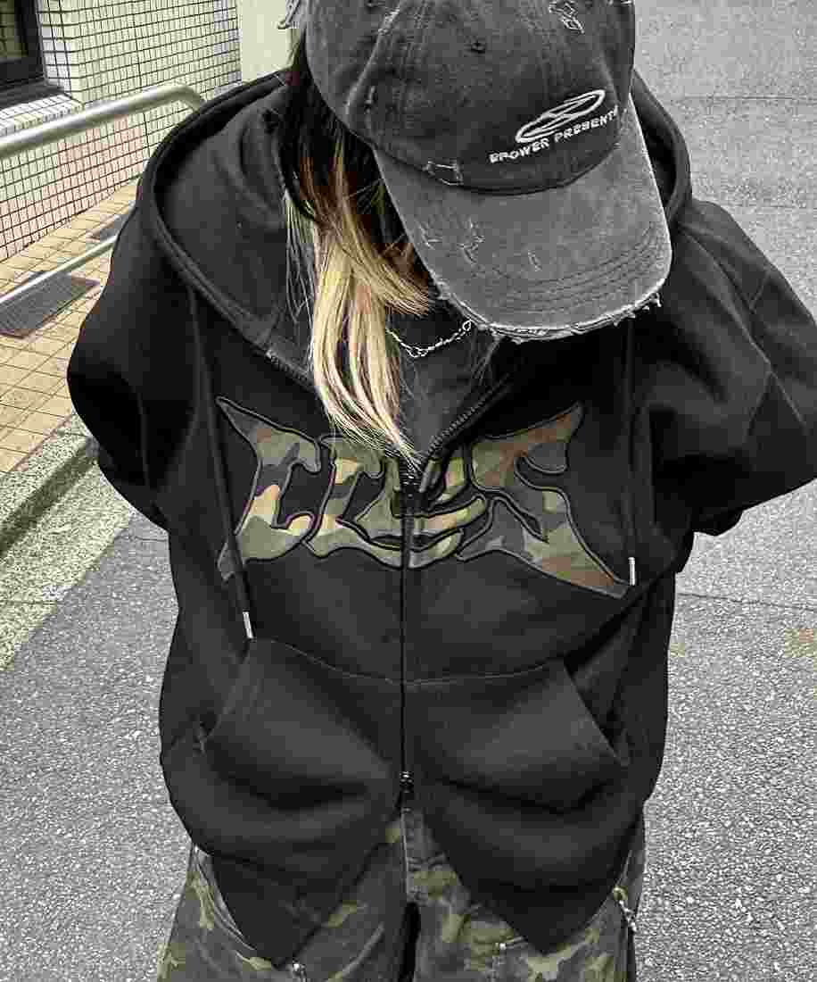 カモフラロゴが映える、オーバーサイズなストリートジップアップ