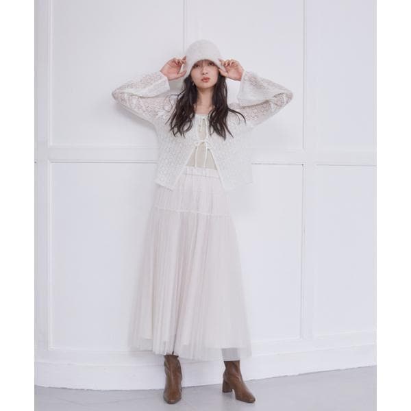 ふわふわ糸で作った透かし編みニットは、フロントリボンがポイント。ニットインナー付きの2点で、アンサンブルとしても、別々でも着用いただけます。ヘアリーな透け感が今ドキ感を演出してくれます。<素材>梳毛糸を使用しています。<詳細>仕様・前紐裏地・なし透け感・あり / 光沢・なし / 伸縮性・あり 生地の厚さ・薄手※モデルの着用画像の場合、光の当たり具合により、実際の色味と異なって見えることがございます。色味は、商品単体の画像をご参照ください。