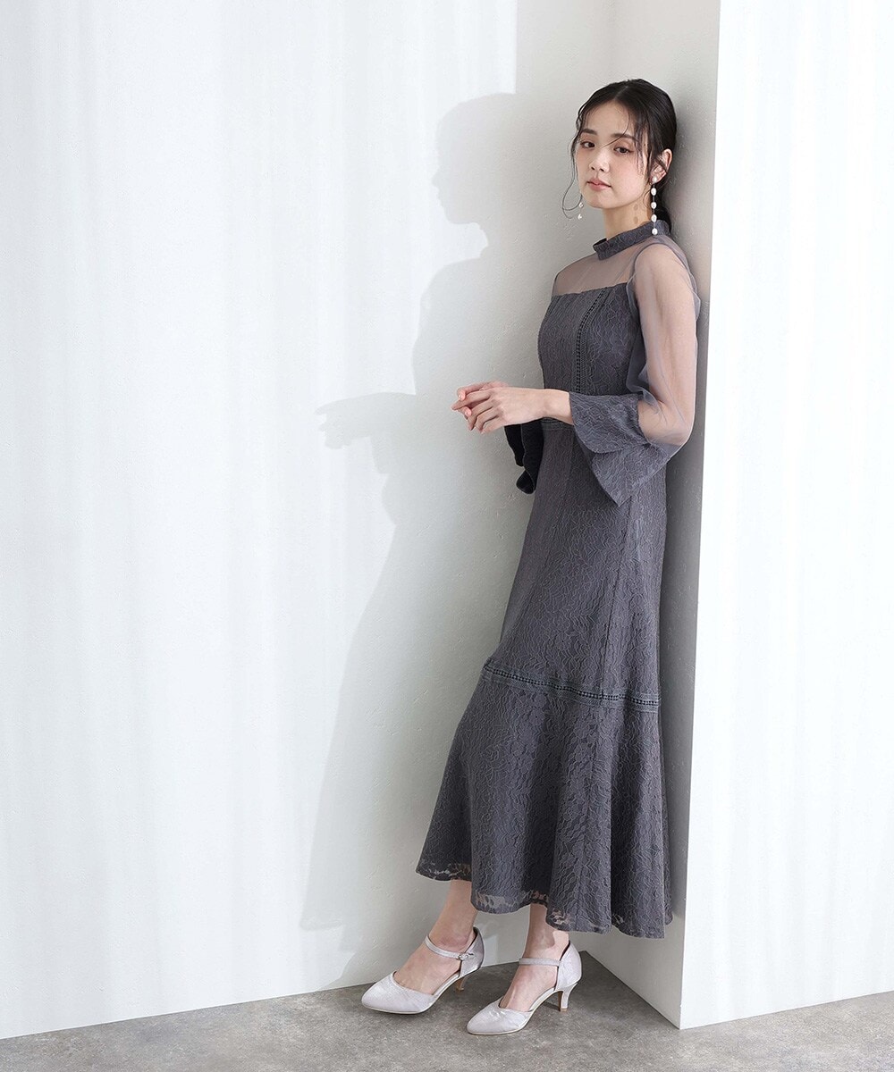 繊細なレースと透け感のあるシアー素材が上品なミディアムドレス