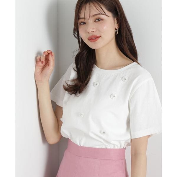 ピグメント加工で風合いを出したTシャツに、艶めくスパンコールでフラワーモチーフを立体的に表現したデザイン。少しゆったりとしたシルエットなので着こなしやすく、フェミニンなスカート合わせがお勧めです。