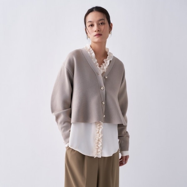 ・裾に向かってふんわりと広がるペプラムシルエットが、トレンド感と女性らしさを引き立てるニットカーディガン。