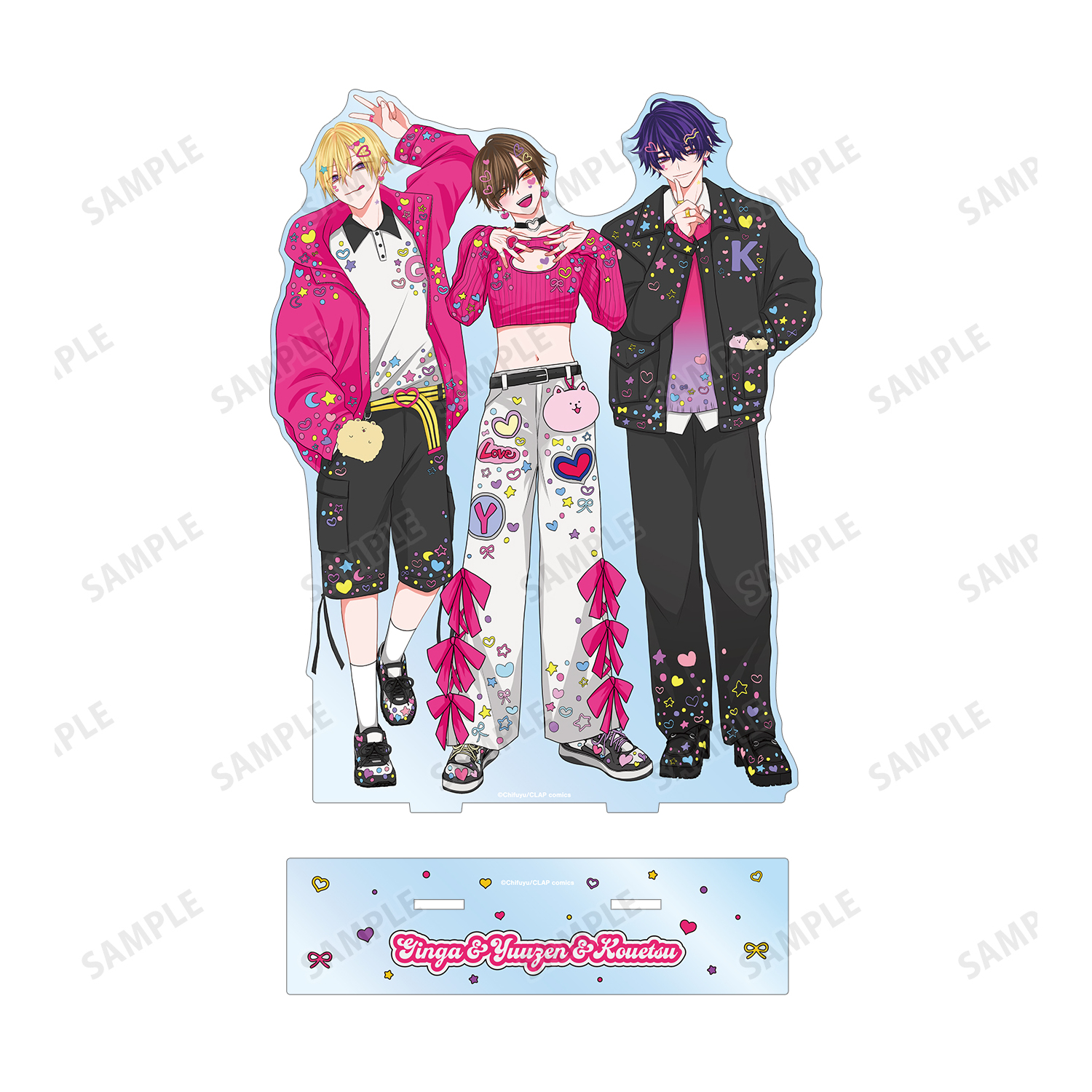 ちふゆ先生描き下ろしイラストの桐ヶ谷 悠然、佐江城 銀河、数又 光悦をBIGなアクリルスタンドに仕上げました。