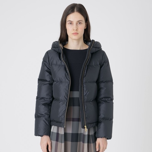 高めの衿で首元から温かく、フード裏のクレストブリッジチェックがアクセントになっています。