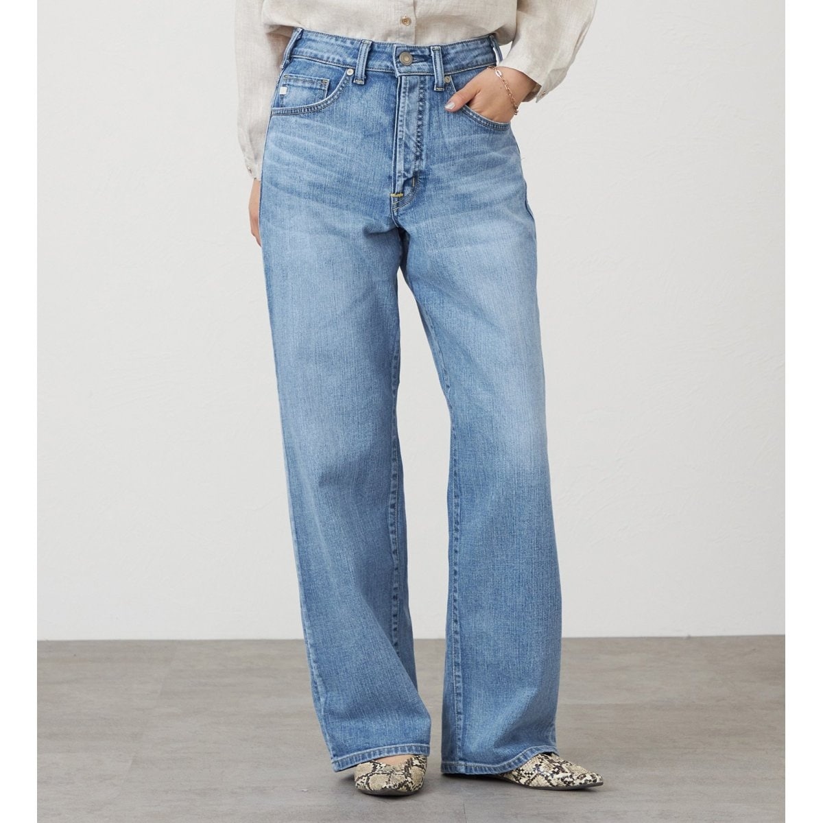 タテ糸には、番手やムラ形状の異なる2種類の糸を使用することで、表情豊かな加工感が際立ちます。ヨコ糸には、リサイクル旭化成ロイカEF(ポリウレタン)を採用。環境にも配慮しながら、優れたストレッチ性と柔らかな肌触りを両立しました。快適な穿き心地は、デニム特有のゴワつきが苦手な方にもおすすめです。