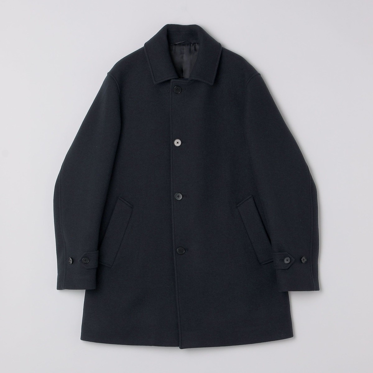 セットインスリーブにシングルブレステッドのステンカラー型と飽きの来ないデザインに仕上がっております。