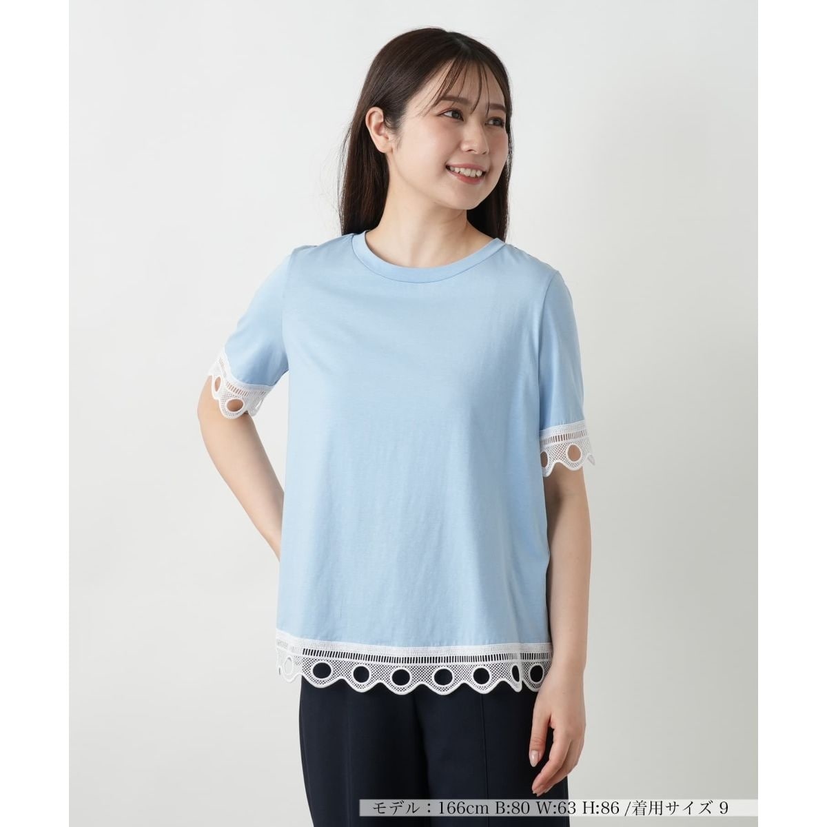 柔らかなコットン素材で仕立てたクルーネックTシャツ。袖口と裾にあしらわれたカットワークレースが軽やかな抜け感を添え、ベーシックな中にもほんのり甘さの漂う一枚。すっきりとした見た目ながら、程よくゆとりを持たせたシルエットで、リラックス感のある着心地もポイント。ワイドパンツでカジュアルにまとめたり、フレアスカートでフェミニンに着こなしたりと、スタイリング次第で印象の変化が楽しめます。