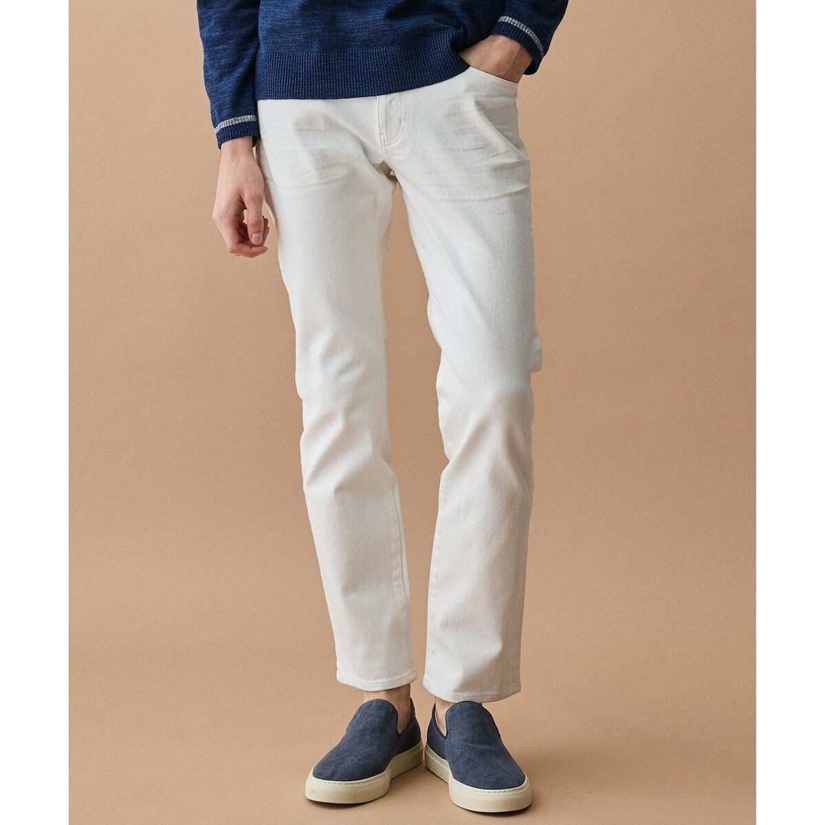 過度なディテールやトリムを排除し、どんなジャケットにも合わせやすい洗練されたデザインに仕上げました。前身頃の太もも付近には控えめな立体ヒゲ(3D)加工を施し、適度な立体感をプラス。身体の動きにフィットするスリムシルエットで、快適さと美しさを両立しています。