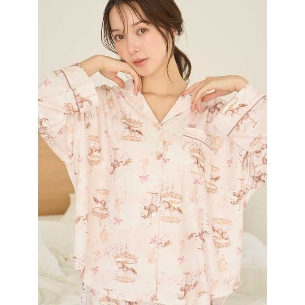 カルーセルや気球、バルーンなどのモチーフを描いた総柄プリントのパジャマシャツ。
