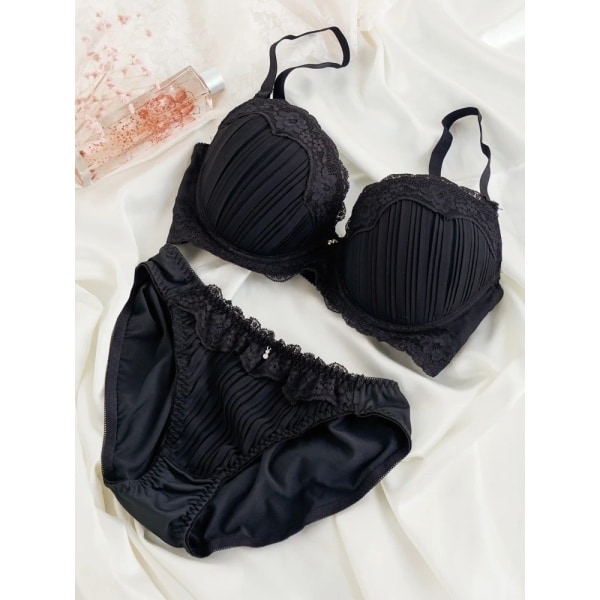 レースとプリーツを組み合わせて愛らしく仕上げたブラショーツセット。