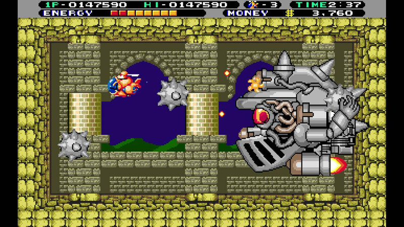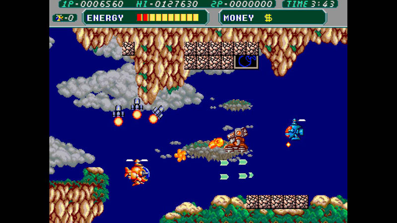 「ミスターヘリの大冒険」は1987年にアーケード用に発売された横スクロールシューティングゲームです。崩壊しかけている惑星を救うため、小さな足のあるオレンジ色の愛らしいヘリコプター「ミスターヘリ」を操り、緑の浮遊島や動く岩盤地帯、地底の時計塔など様々なステージで敵を倒し障害物を回避しながら進んでいきます。途中水晶を集めるとパワーアップするアイテムを購入することができるので十分に強化して、地底奥底に潜む最終ボスMUDDYを倒すのが目的です。この時期のアイレム作品には珍しいポップで鮮やかなグラフィックとコミカルなキャラクターが特徴ですが、難易度は高く相当やり応えがあります。「アイレムコレクションVol.3」では1989年に発売されたPCエンジン版も収録しています。