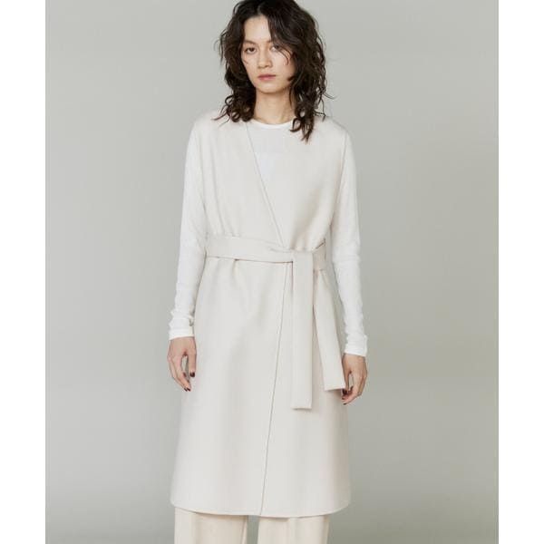 ■デザインキレイなフォルムの出る素材を使用したオーバージレ。ベルトを結んだ際、後ろにニュアンスが出る立体的なパターンシルエットになっています。袖ぐりを大きく開け、少し厚みのあるインナーとお楽しみいただけるサイジング。リバー仕立ての高級感ある仕様なので羽織るだけでサマに。ベルト無しでさらりと羽織るのはもちろん、付属のベルトでウエストマークしてシャープなスタイリングにも◎。■素材ベース糸は経緯とも、梳毛W100%の2/48で、接結糸に綿100/2を使用した、2/2綾の接結2重織です。堅めの仕上がりとなるよう、樹脂加工を調整し、特殊な蒸絨器を使用した、抑えた質感が特徴です。(カマ押え)糸染めから製織、最終の整理加工まで尾州産地で作られた素材です。固くしまった梳毛らしい風合いにしています。・裏地あり(背抜き)・ポケットあり・共地ベルト付き■下げ札サイズ表記4=(13号)■サンプル撮影商品画像の商品はサンプルです。実際の商品とはサイズや色味、素材、デザイン等の仕様が若干変更になる場合がございます。■カラーについては、可能な限り実際の商品に近いカラーで撮影をおこなっておりますが、照明の関係により実際の製品とは色味が違って見える場合があります。またパソコン・スマートフォンなどの環境により、若干製品と画像のカラーが異なる場合もございます。現物と画像のカラー差異については返品理由となりませんので、予めご了承ください。■サイズ表記はあくまで目安となります。