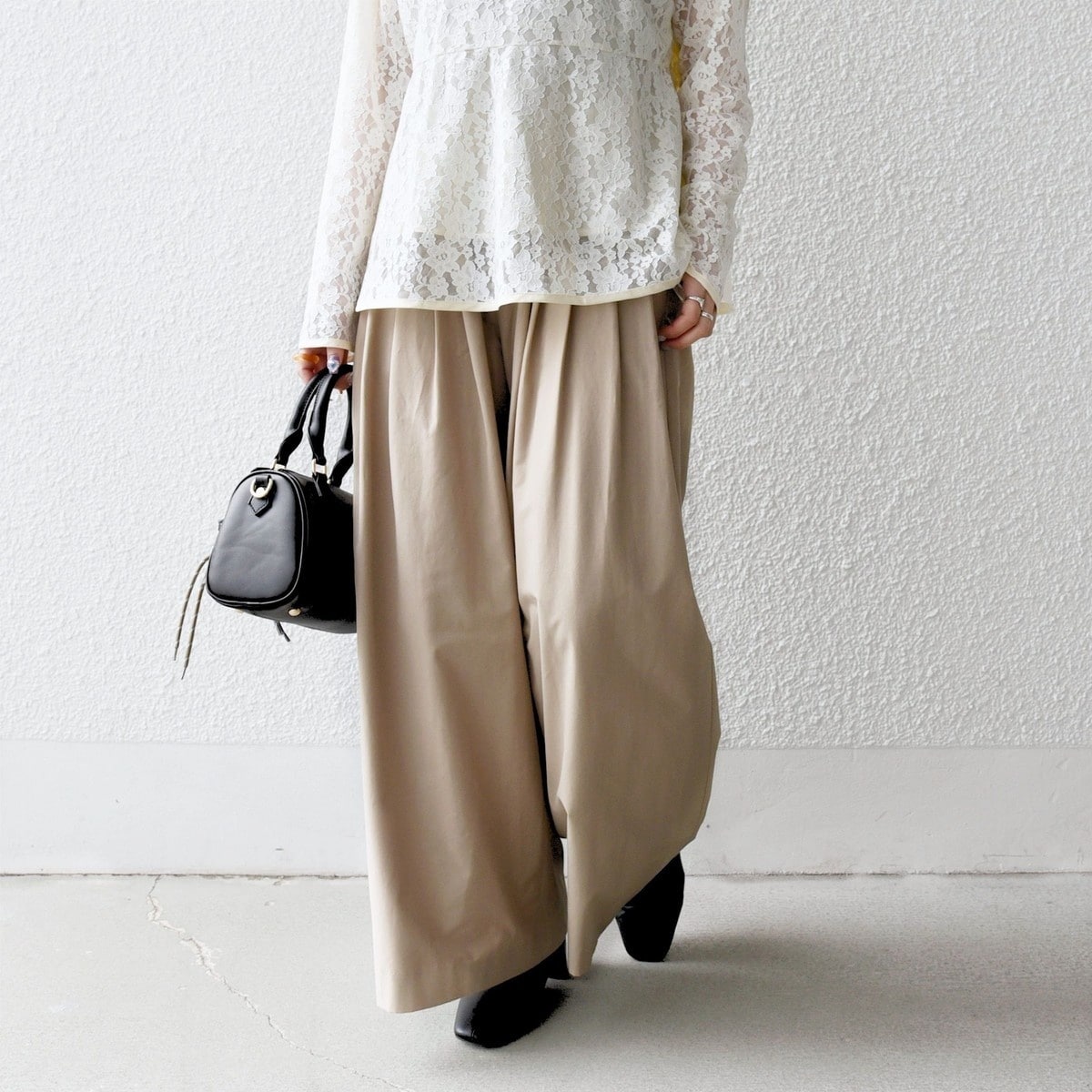 ボリュームのあるシルエットなので、ショート丈のトップスやアウターとのバランスが◎