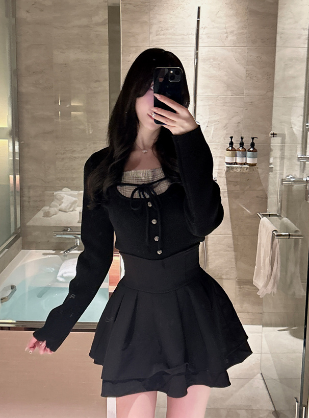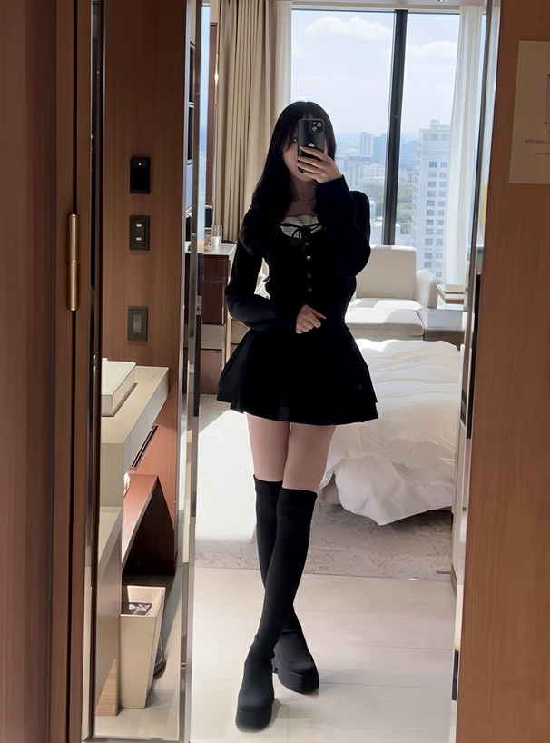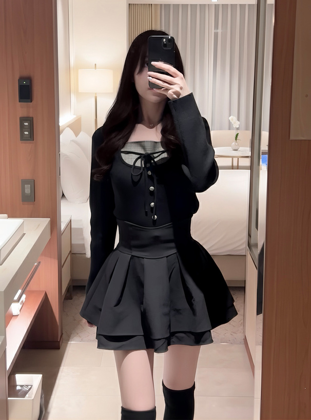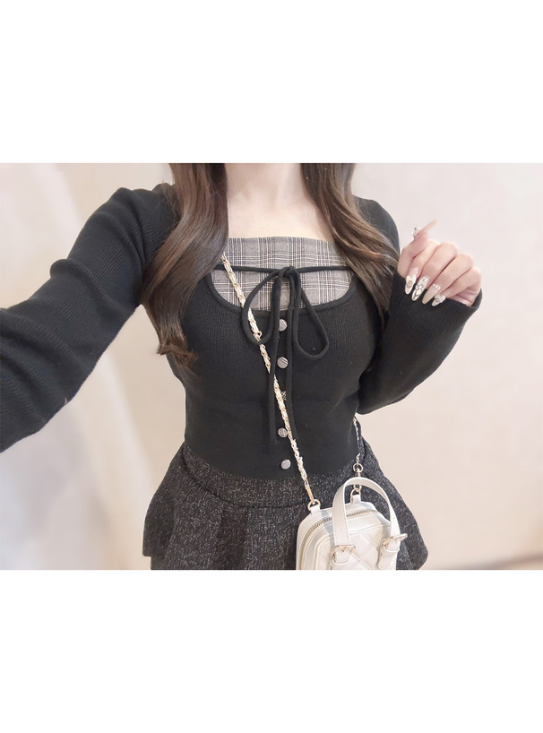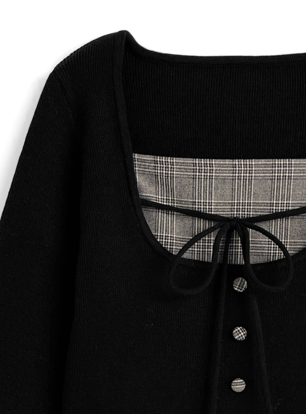 胸元のグレンチェック生地やくるみボタン、リボンディテールがクラシカルなアクセント。
