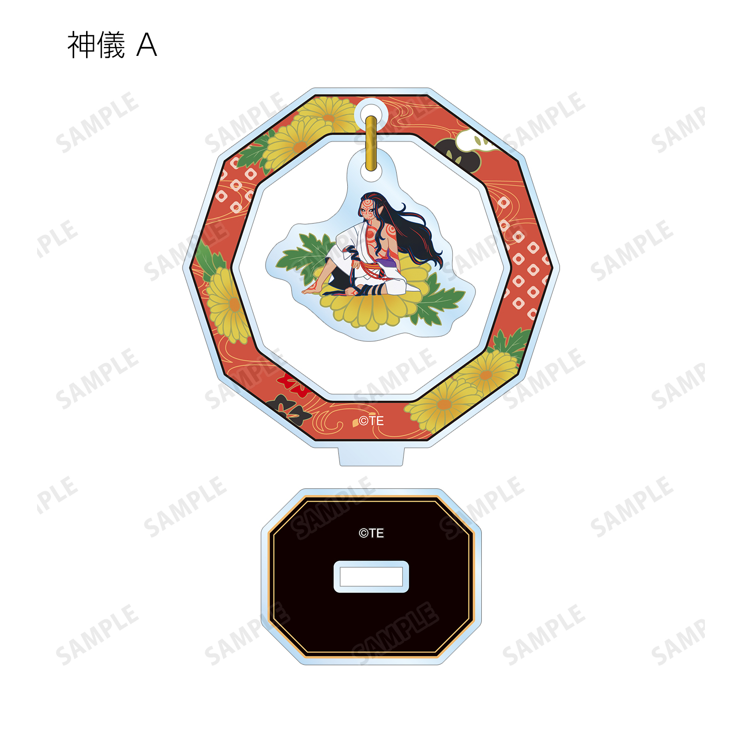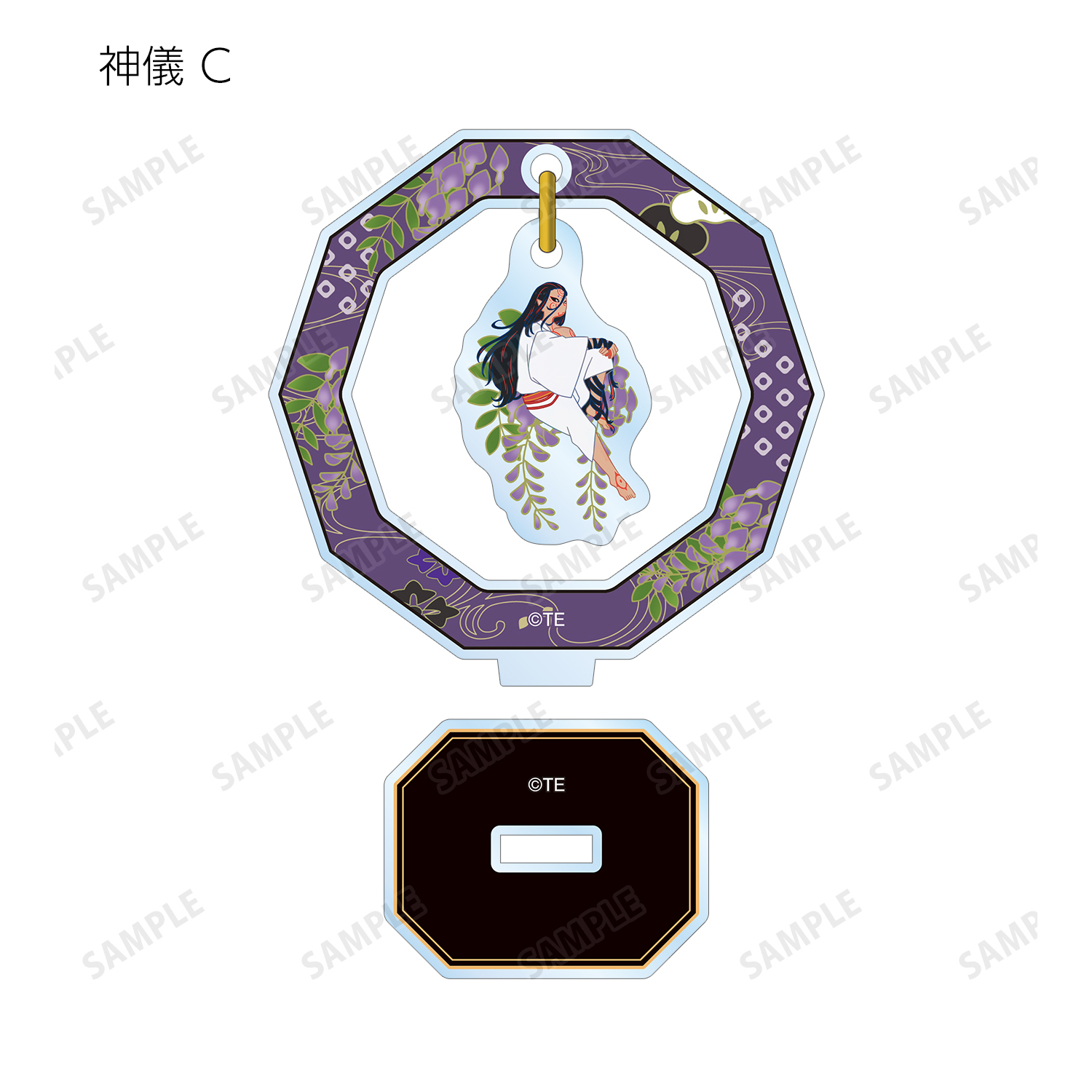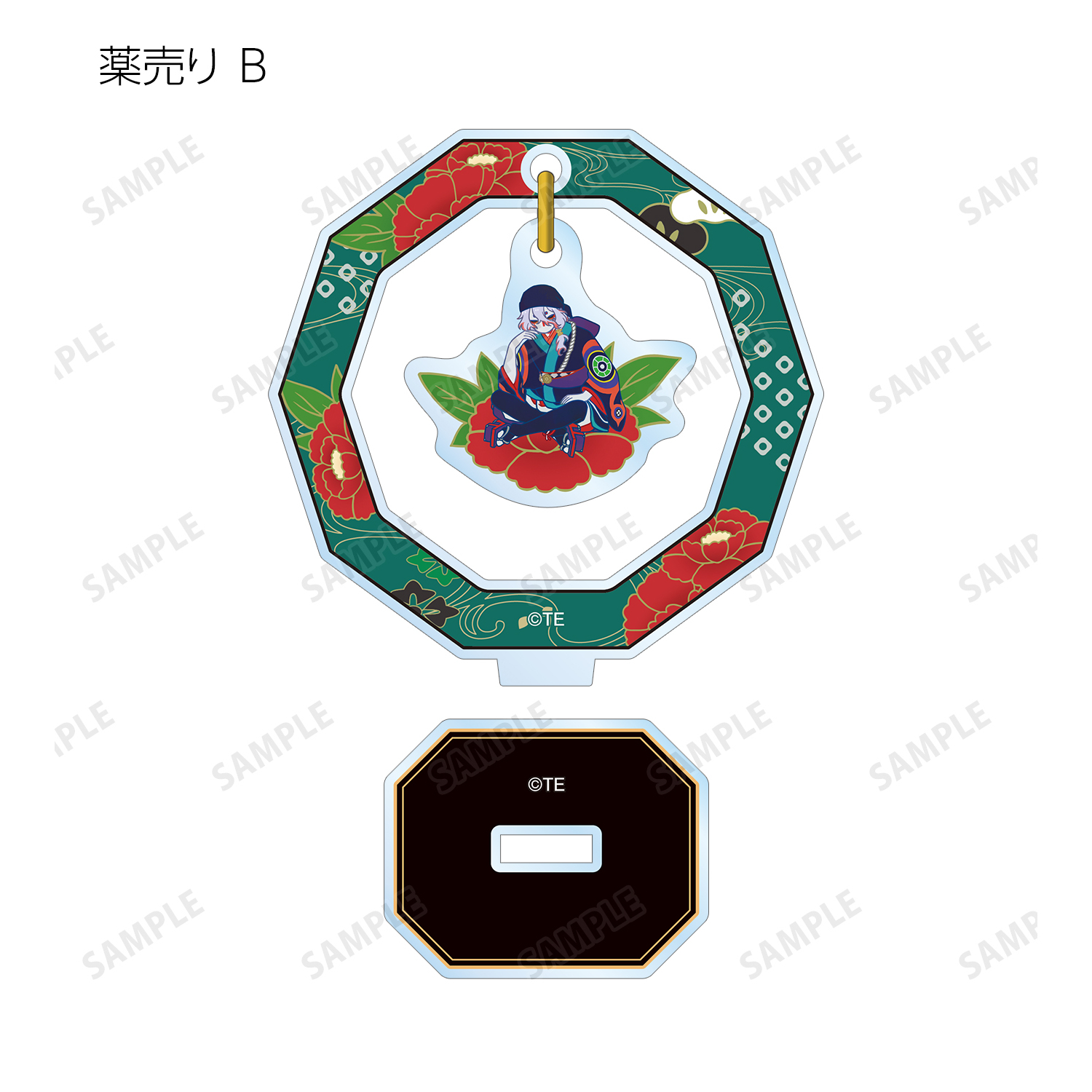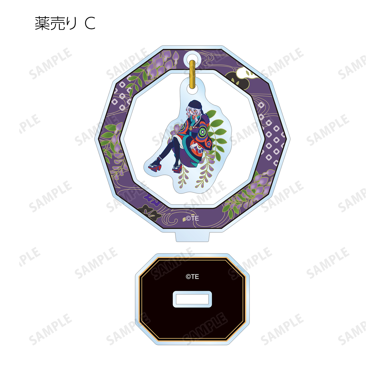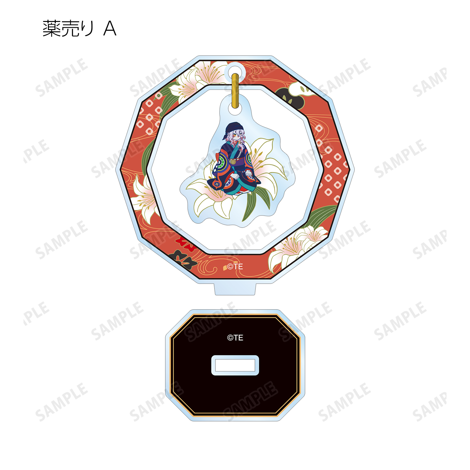 薬売り、神儀のイラストをボタニカルデザインに落とし込んで繊細なタッチで新たに描き起こし、ゆらゆら動くアクリルスタンドに仕上げました。