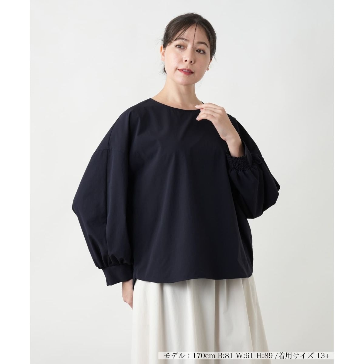 袖の内側にループがあり、留めることでタックディテールを作ることが出来る2WAYタイプのブラウス。スタイリングによって、お好みでの着こなしが楽しめます。コットンのような表情感と風合いのポリエスエル素材を使用しています。さらっとした肌触りが特長。