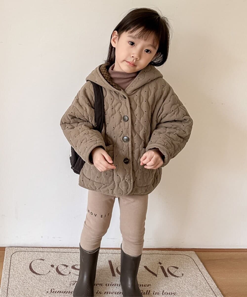 さりげないドット柄がお洒落なアクセントになっているキルティングジャケット。キルティング加工が保温性を高めつつ、すっぽり被れるフードもついているため防寒性も抜群!裏地はチャック柄で、カジュアルで可愛らしい印象をプラスしています。ナチュラルで温かみのあるカラーのため、コーディネートも組みやすい。ゆったりとしたシルエットなので厚手のトップスも着込めて、さまざまなスタイルに合わせることが出来る秋冬大活躍のアイテムです。