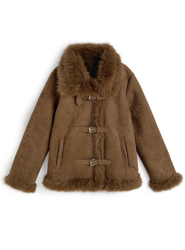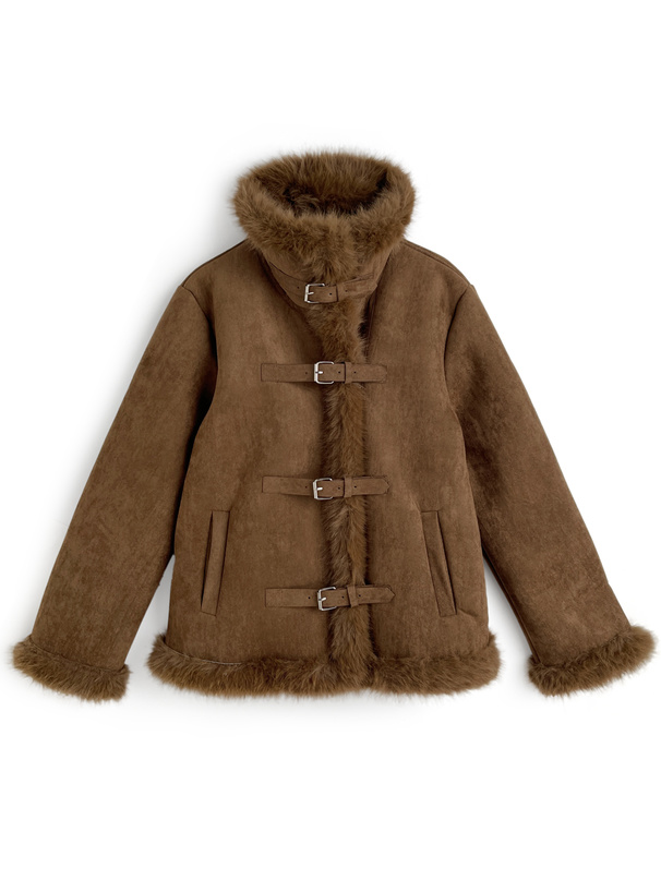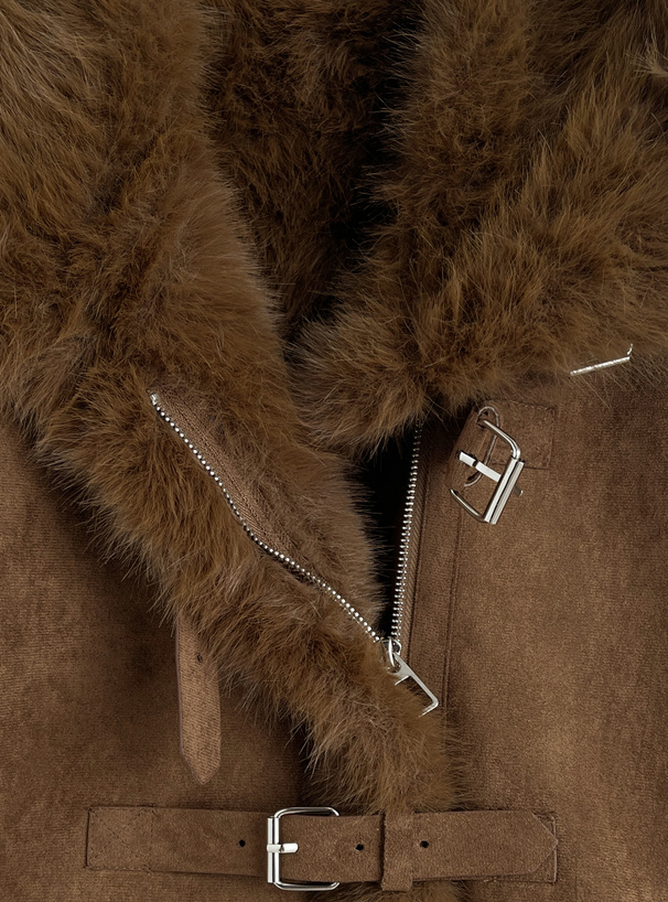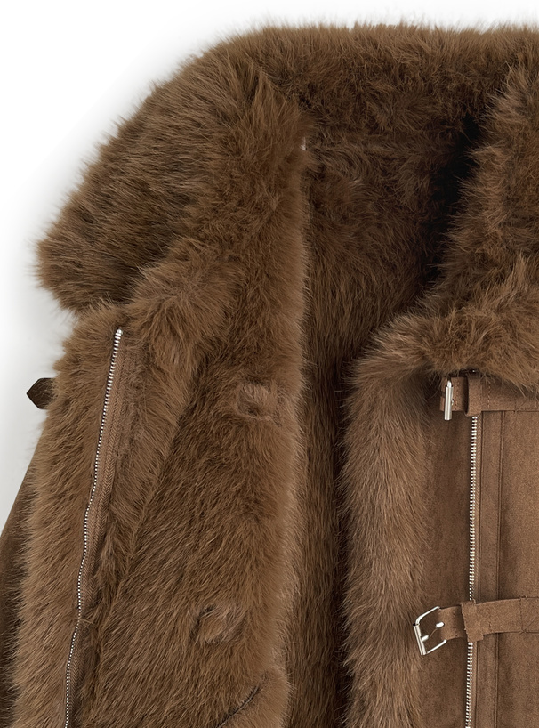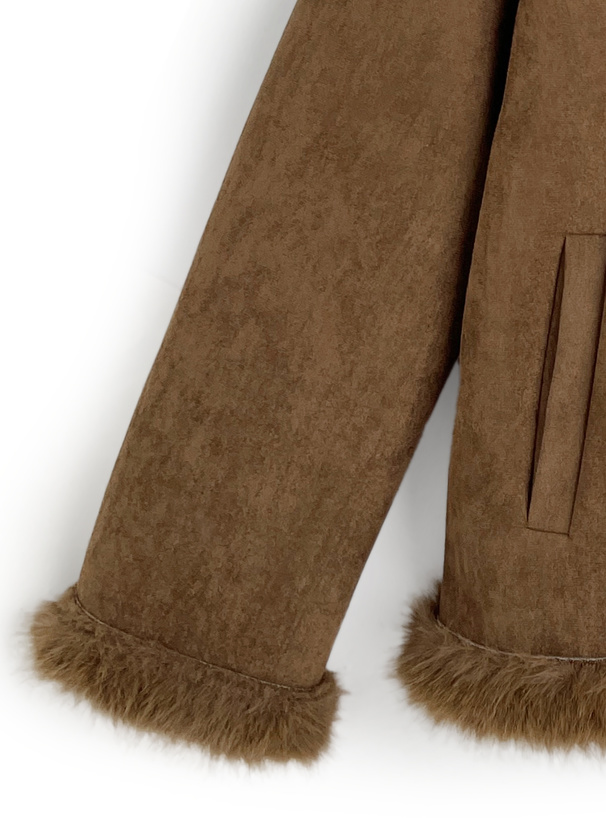 しっとりとしたスエード調素材と毛足の長いエコファーを組み合わせたリッチなジャケット。