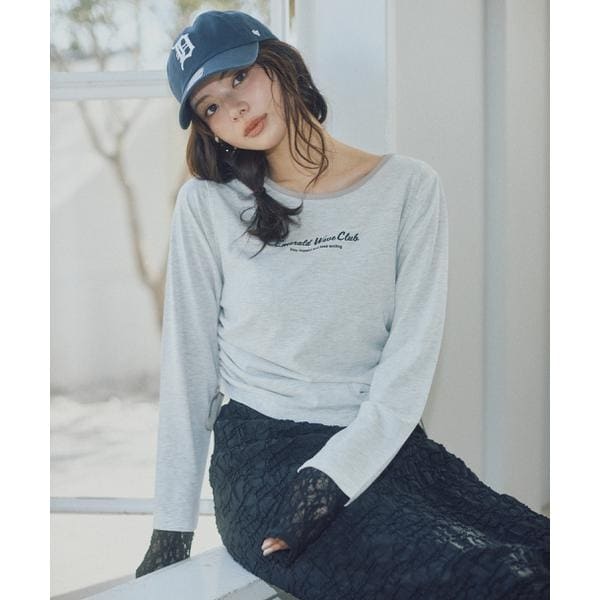 サイドのドロストリボンがポイントのトップス。ドロスト部分を絞ると、お好みの着丈に調節できるので幅広いボトムスと着回せます。ロゴがアクセント。肌触りの良い薄手のカットソーを使用。程よいシアー感があるので春らしい爽やかな印象に見せてくれます。