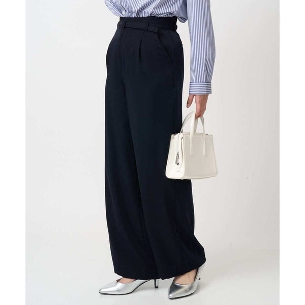 すっきりとしたワイドシルエットパンツ。ウエストには共地のベルトがついているので、ベルトのバックルがコーディネートのアクセントに。落ち感のある素材なので、ワイドシルエットですが上品な印象で履きこなしていただけます。