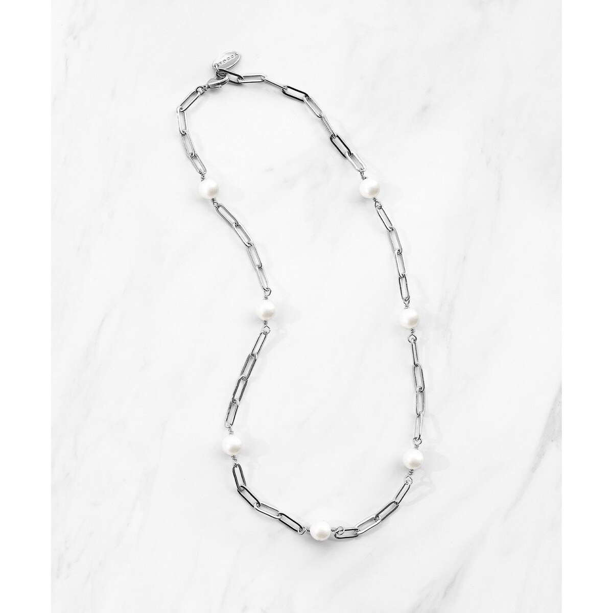 着けるだけでスタイリングをリュクスでスタイリッシュにアップデートできる、シンプルな淡水パールチェーンネックレス。チェーンは一コマずつがモダンなフォルムで抜け感があるデザインのものをチョイス。天然の淡水パールをひとつずつ丁寧にワイヤーで巻き、全体に散りばめていて、洗練されたノーブルなたたずまいと華やかさを兼ね備えます。